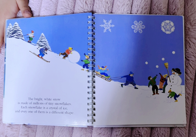The bright, white snow is made of millions of tiny snowflakes. Each snowflake is a crystal of ice, and every one of them is a different shape. (반짝이는 하얀 눈은 수백만 개의 작은 눈송이로 만들어져 있어요. 각 눈송이는 얼음 결정이고, 모두 다른 모양이에요.)
