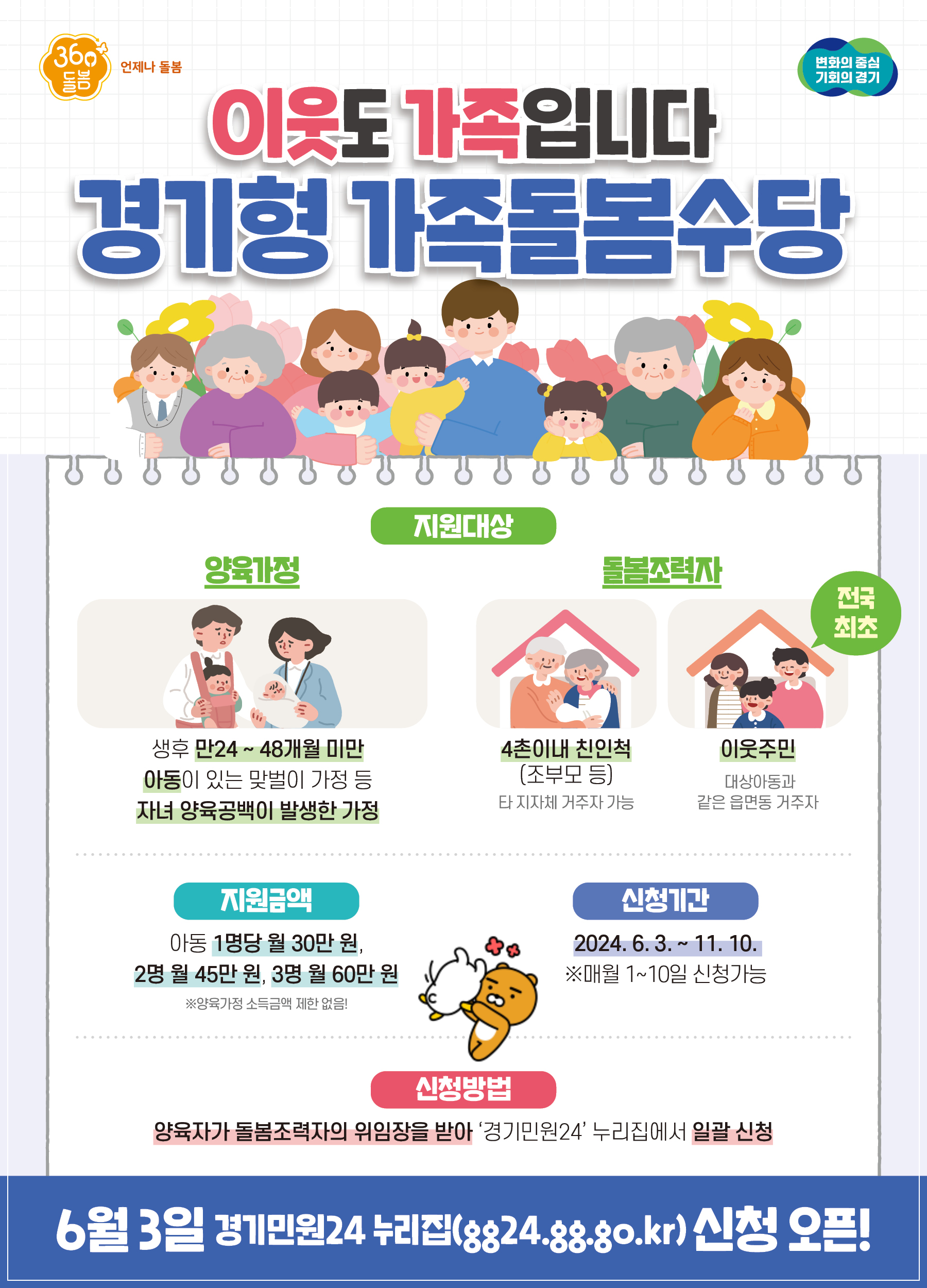 경기도는 생후 만 24~48개월 미만 아동을 돌보는 4촌 이내 친인척 또는 이웃 주민에게 돌봄 아동 수에 따라 월 30만~60만 원을 지원하는 '경기형 가족돌봄수당' 신청 접수를 2024년 6월 3일부터 시작합니다.
