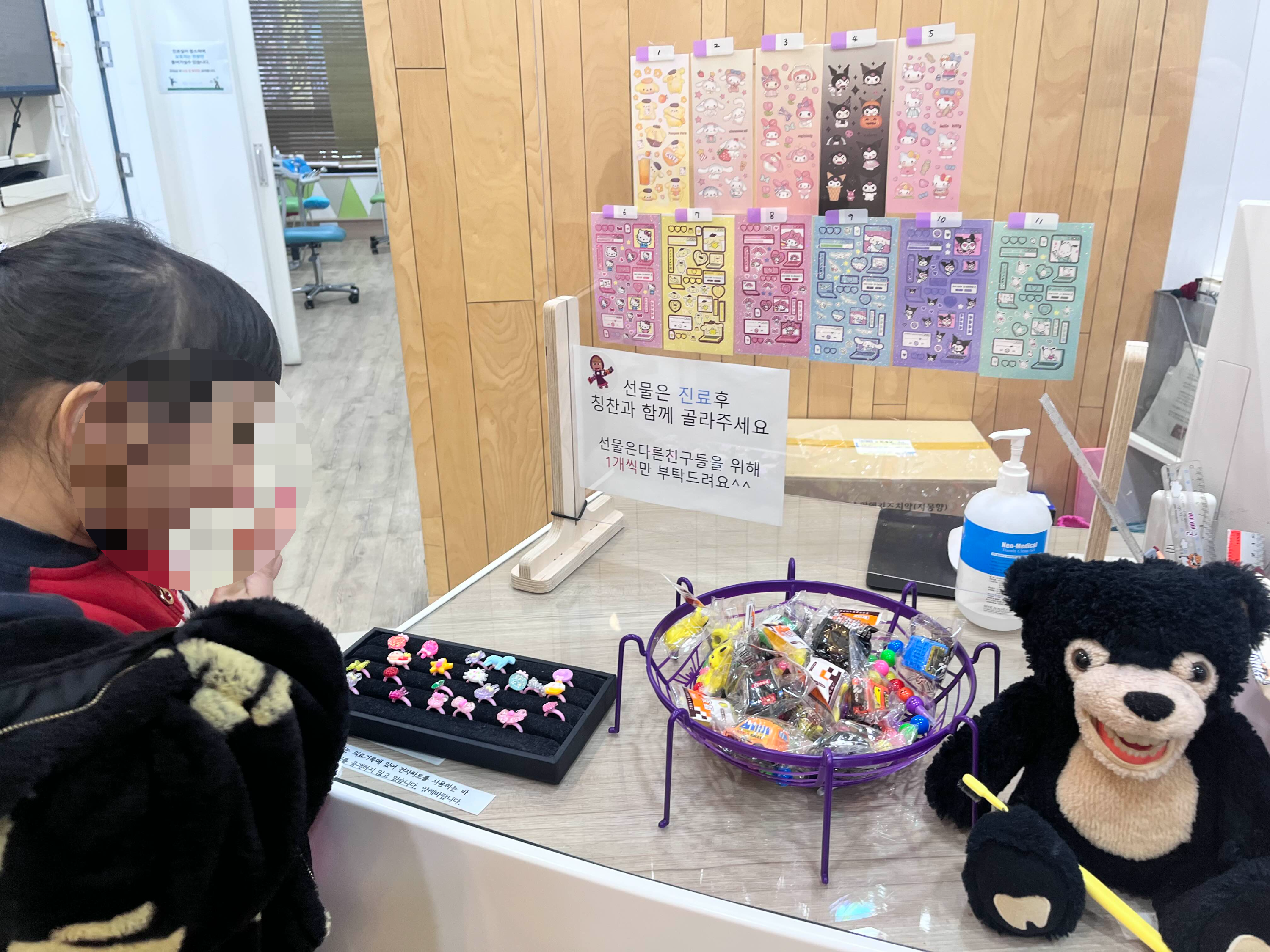 치과 카운터 데스크 옆에는 이렇게 선물들이 준비되어 있어요.