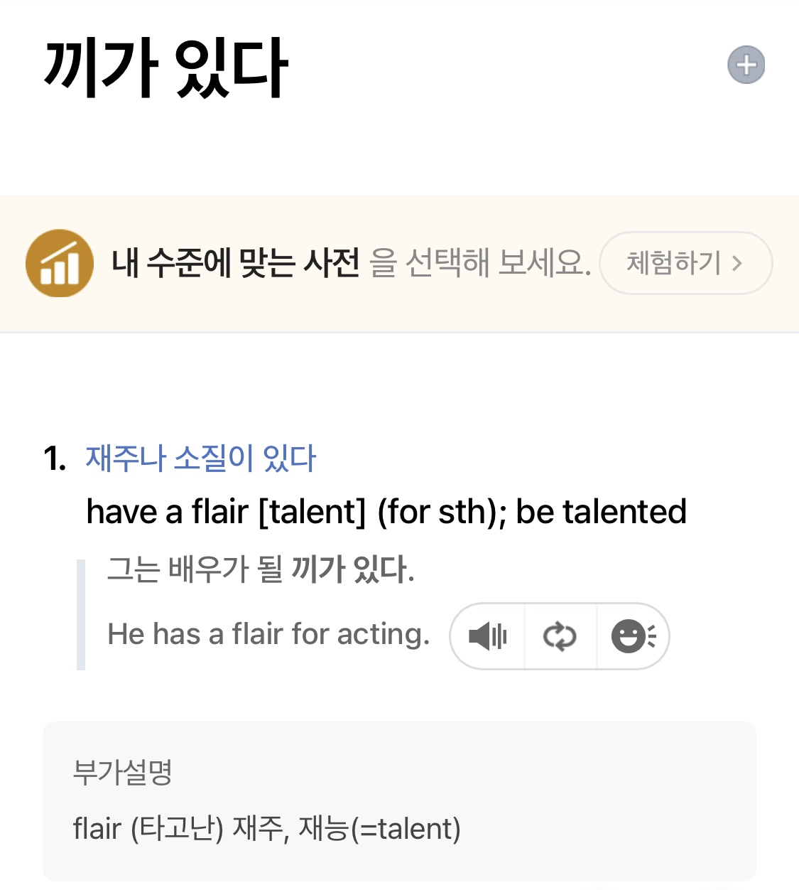 예시: He has a flair for acting. → 그는 연기에 끼가 있다.