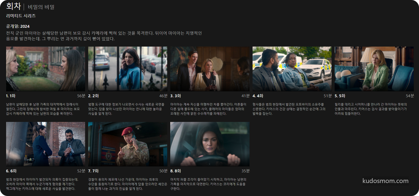 넷플릭스의 '비밀의 비밀'은 총 8화로 구성된 시리즈입니다. 2024년 1월 1일에 공개된 이 영국 드라마는 미스터리 범죄 및 스릴러 장르에 속하며, 각 에피소드는 복잡하게 얽힌 비밀과 신뢰할 수 없는 상황들을 탐구합니다.