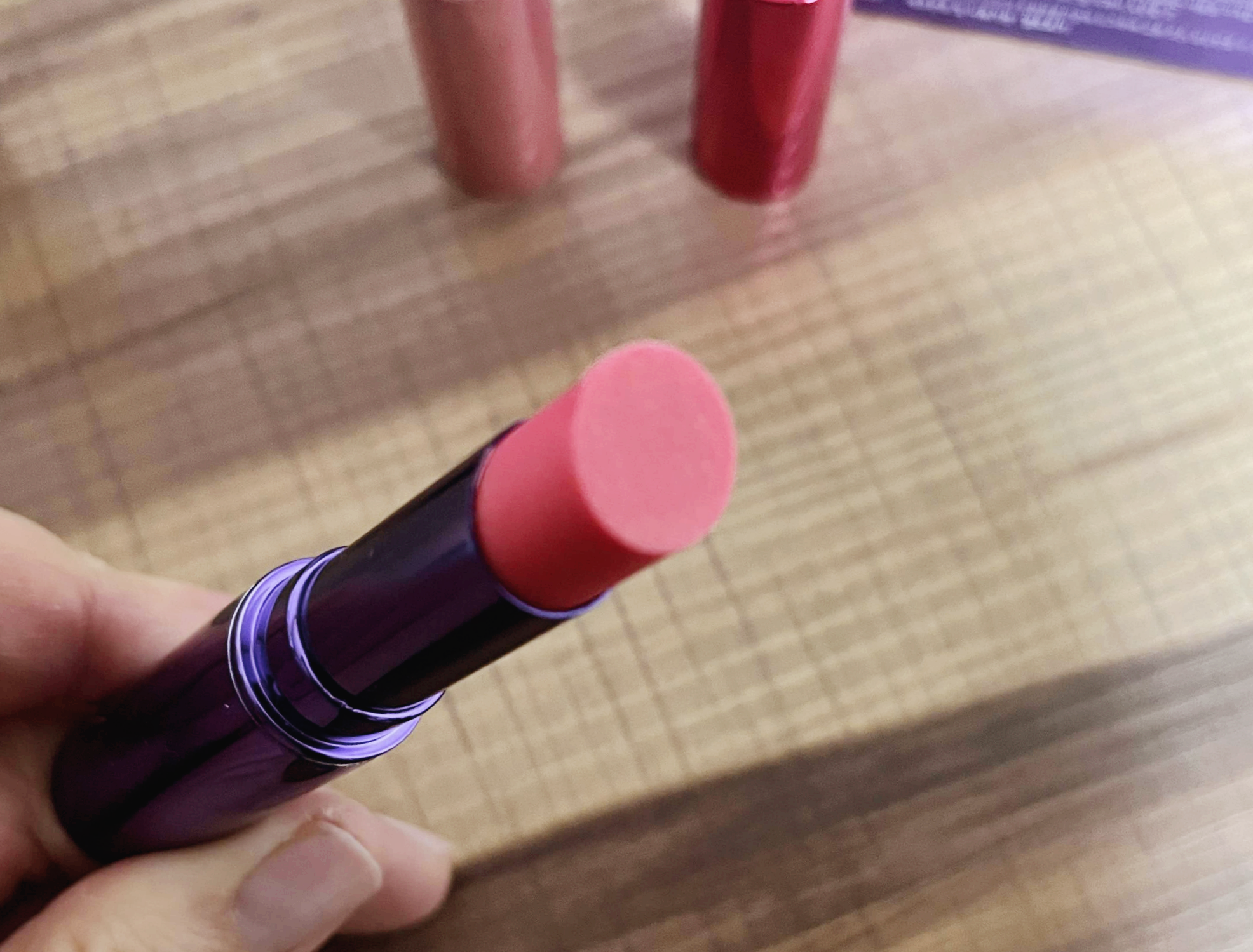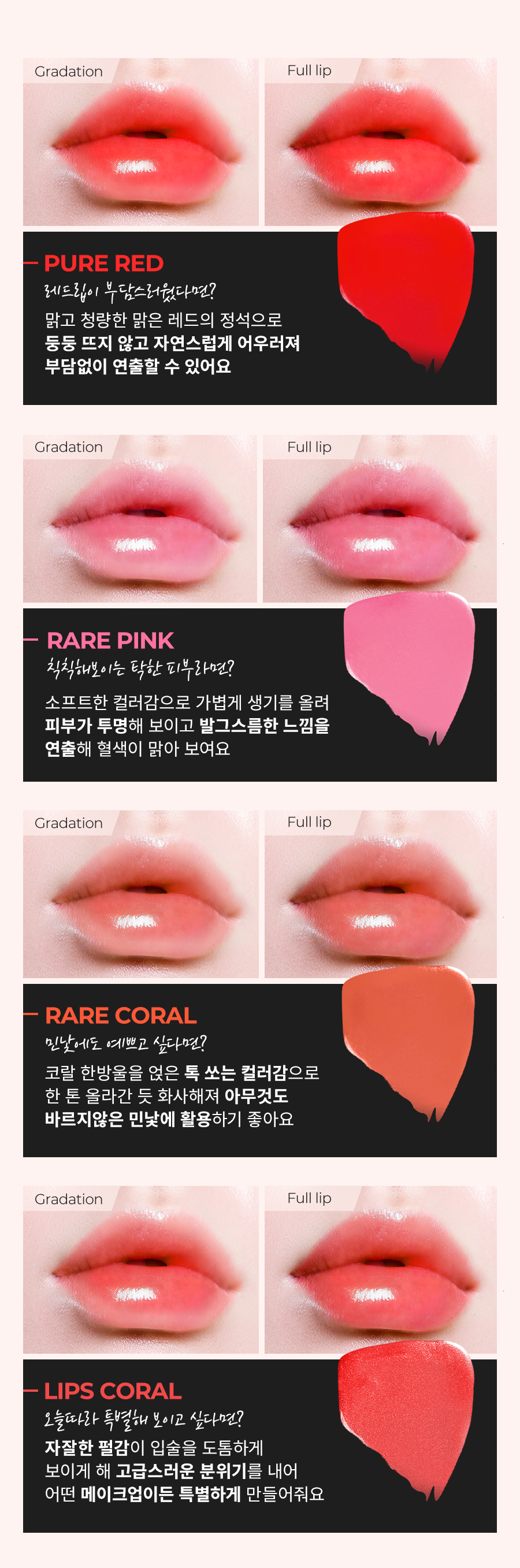 컬러 비교해 보세요. 저는 개인적으로 퓨어레드랑 립스코랄이 예쁘더라고요 :)