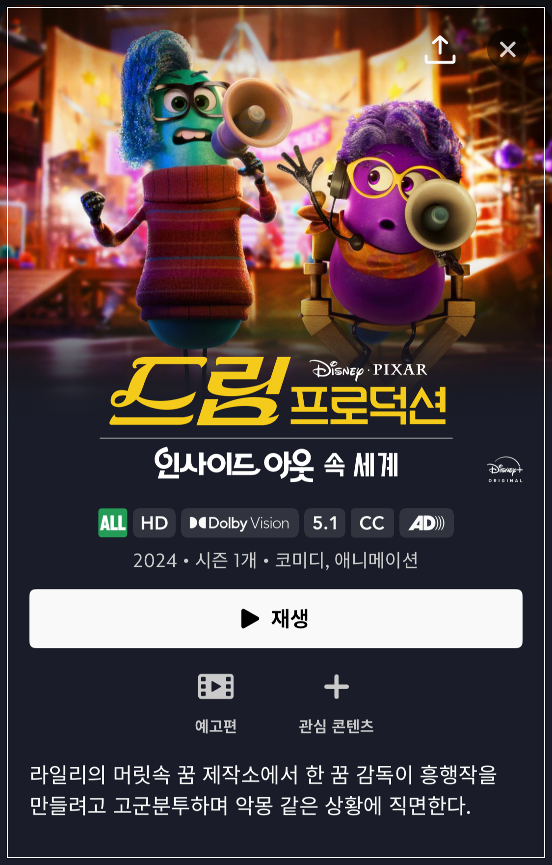 인사이드 아웃 2의 감동이 다 끝나기 전에 외전 같은 이 메니메이션이 나와서 넘 반갑더라고요! 지금 바로 디즈니 플러스를 켜고 라일리의 꿈 속 여정을 함께 떠나보세요! 🌟