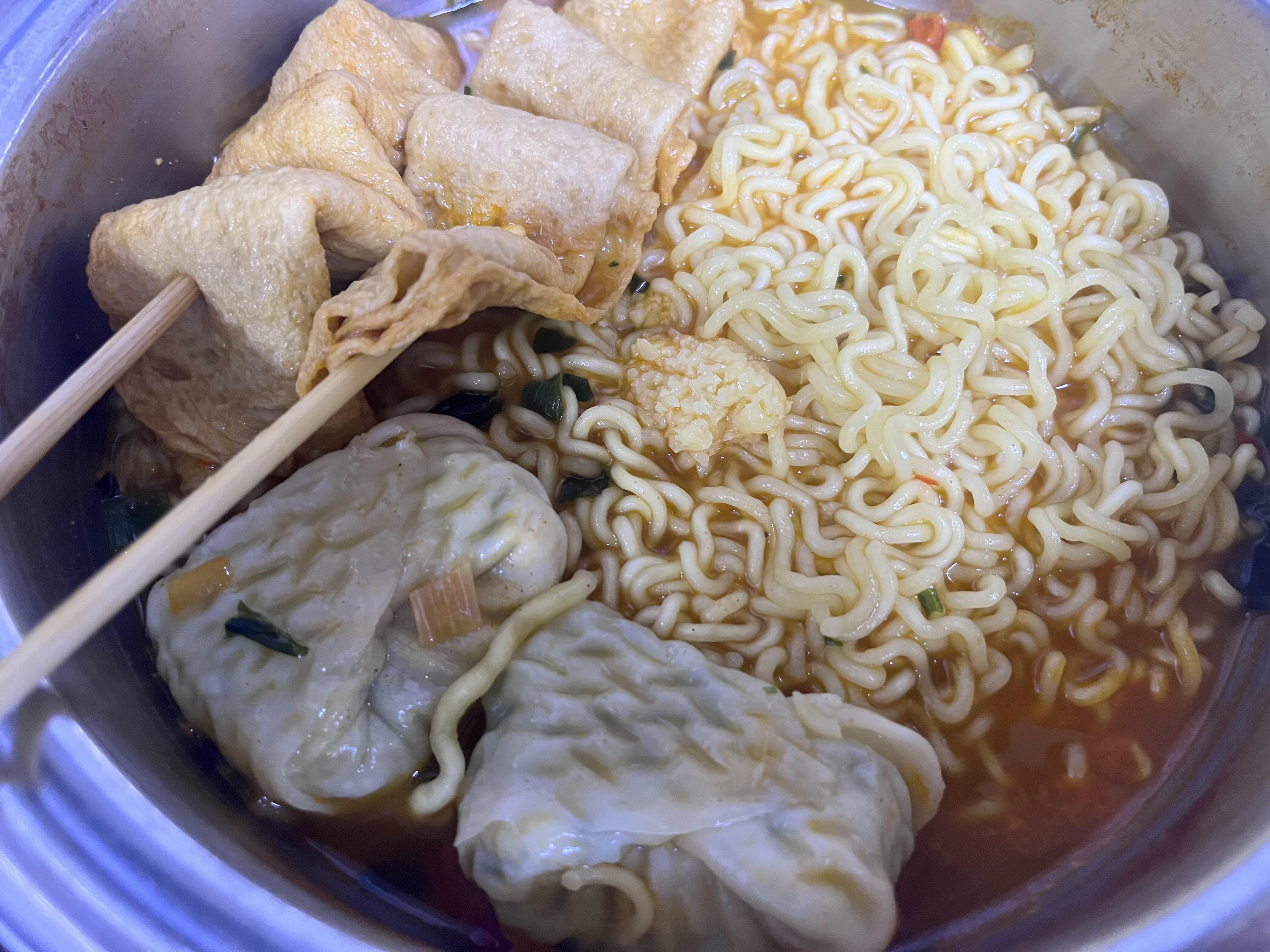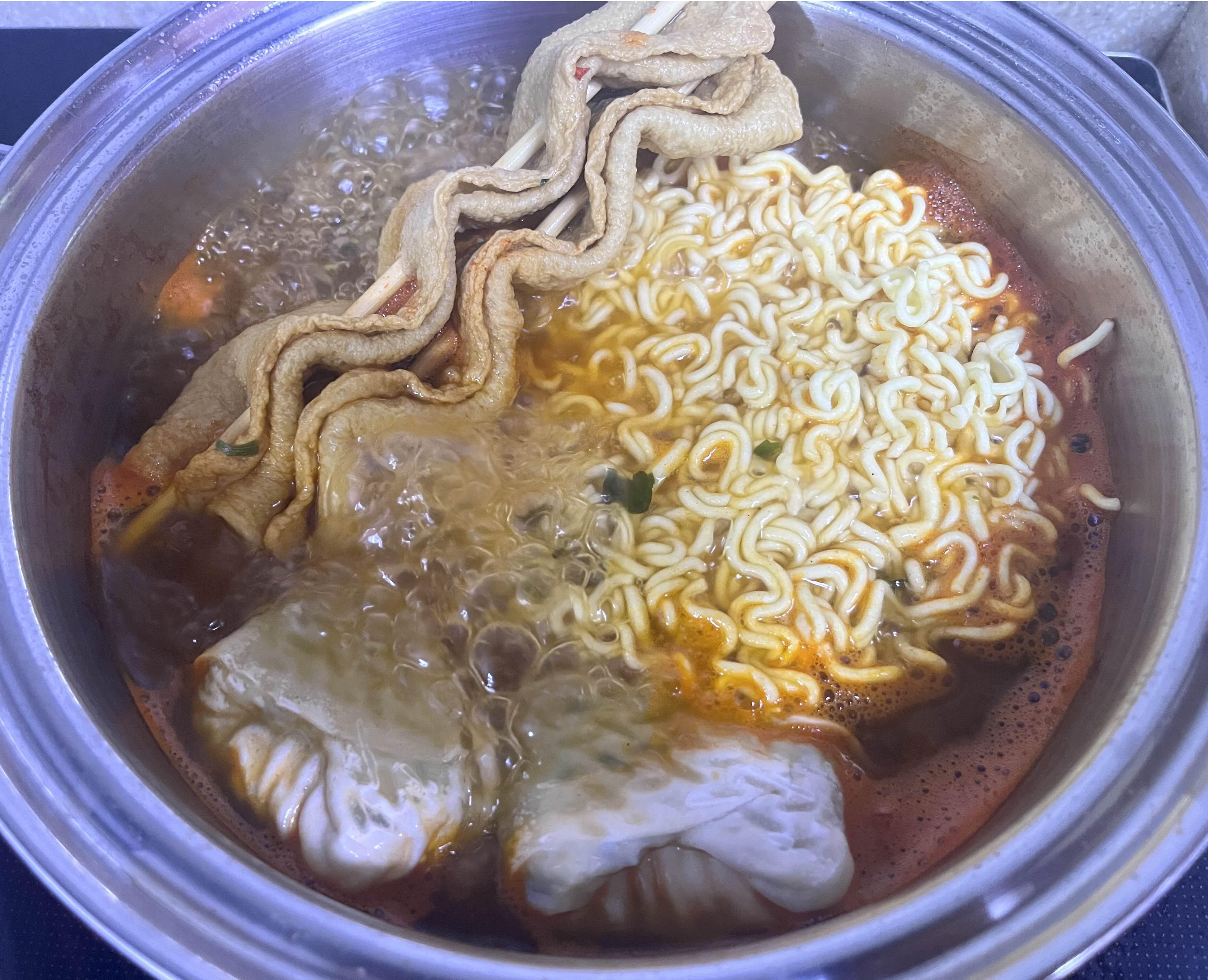 어묵의 달짝지근한 냄새랑 매콤한 라면 냄새가