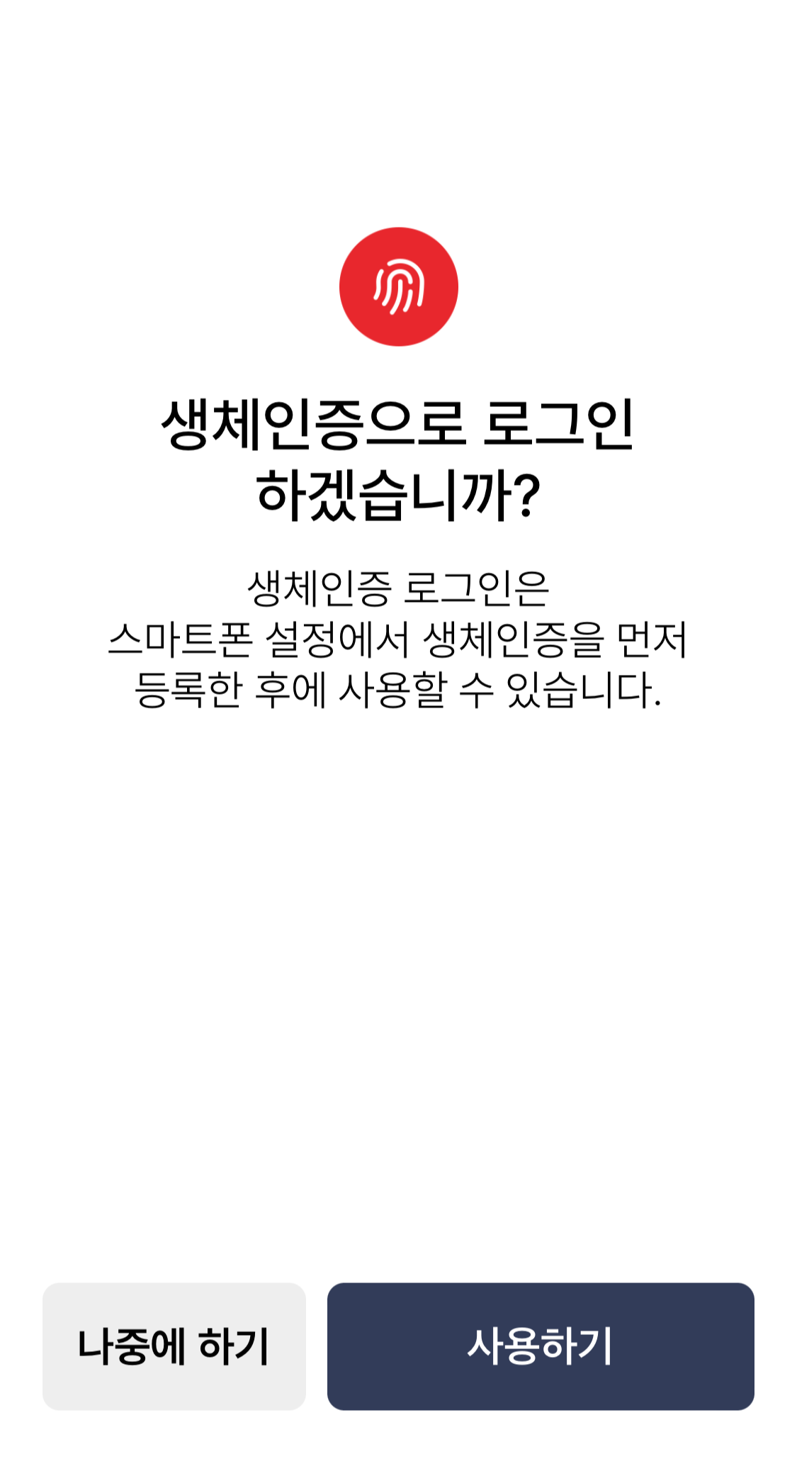 생체인증 로그인을 원하신다면 스마트폰 설정에서 먼저 생체인증 기능을 활성화 시켜야 사용가능합니다.