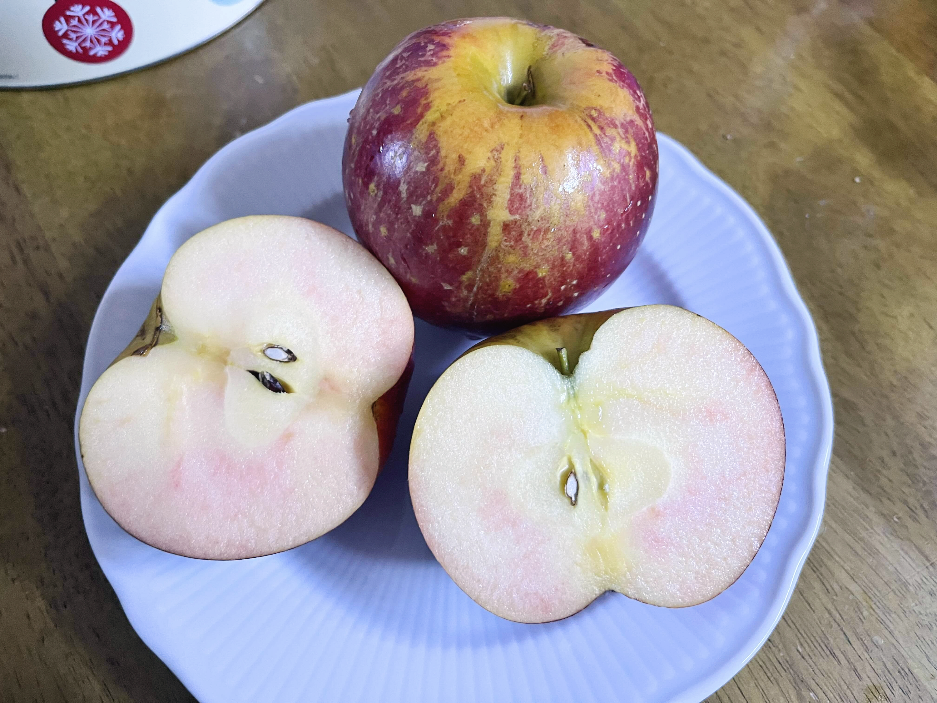 엔부사과의 가장 큰 특징은 속살이 빨간색이라는 점입니다. 이는 사과의 색소 성분인 안토시아닌이 과육 전체에 고르게 분포되어 있기 때문입니다.