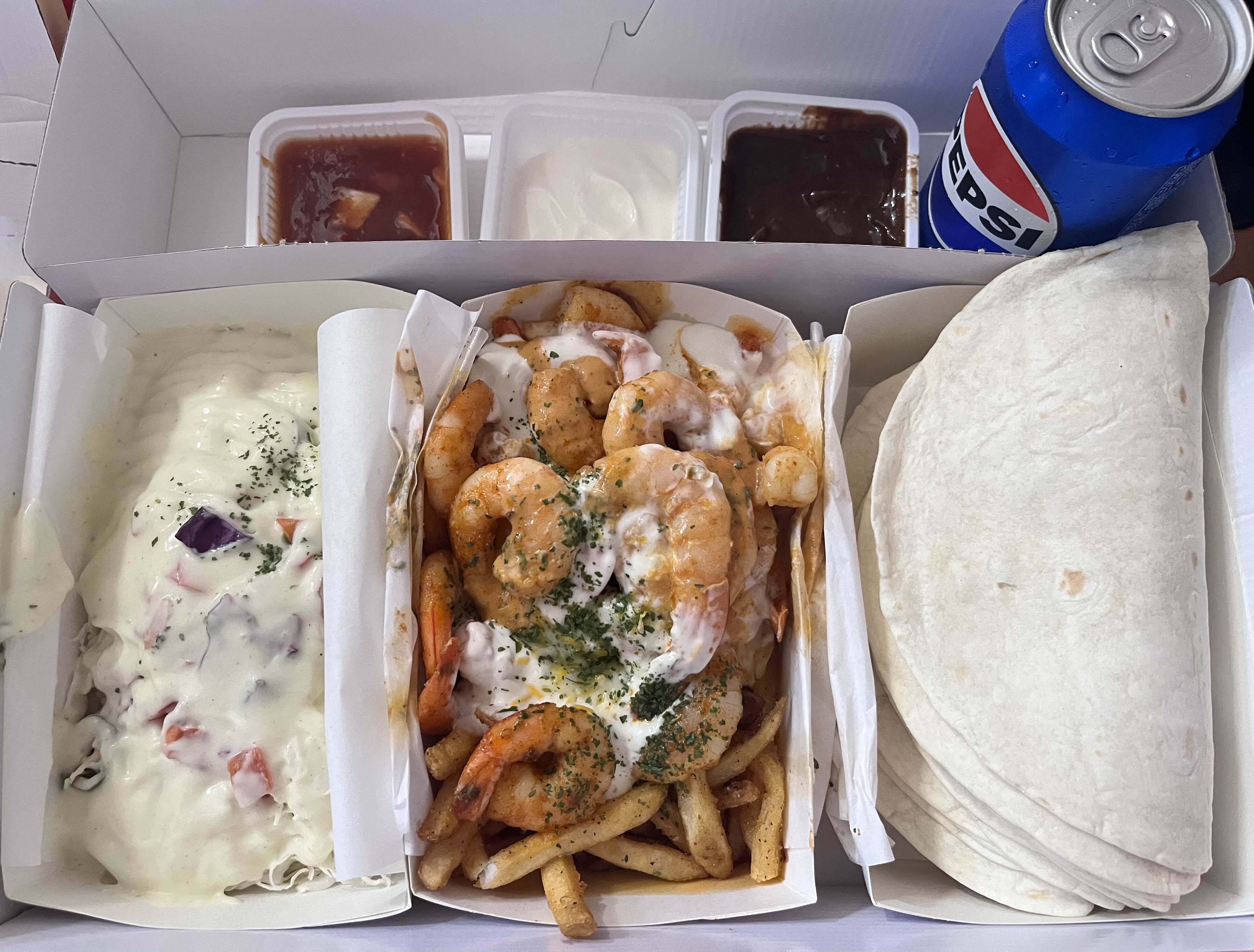 코울슬로 + 새우 + 감자튀김 + 또띠아