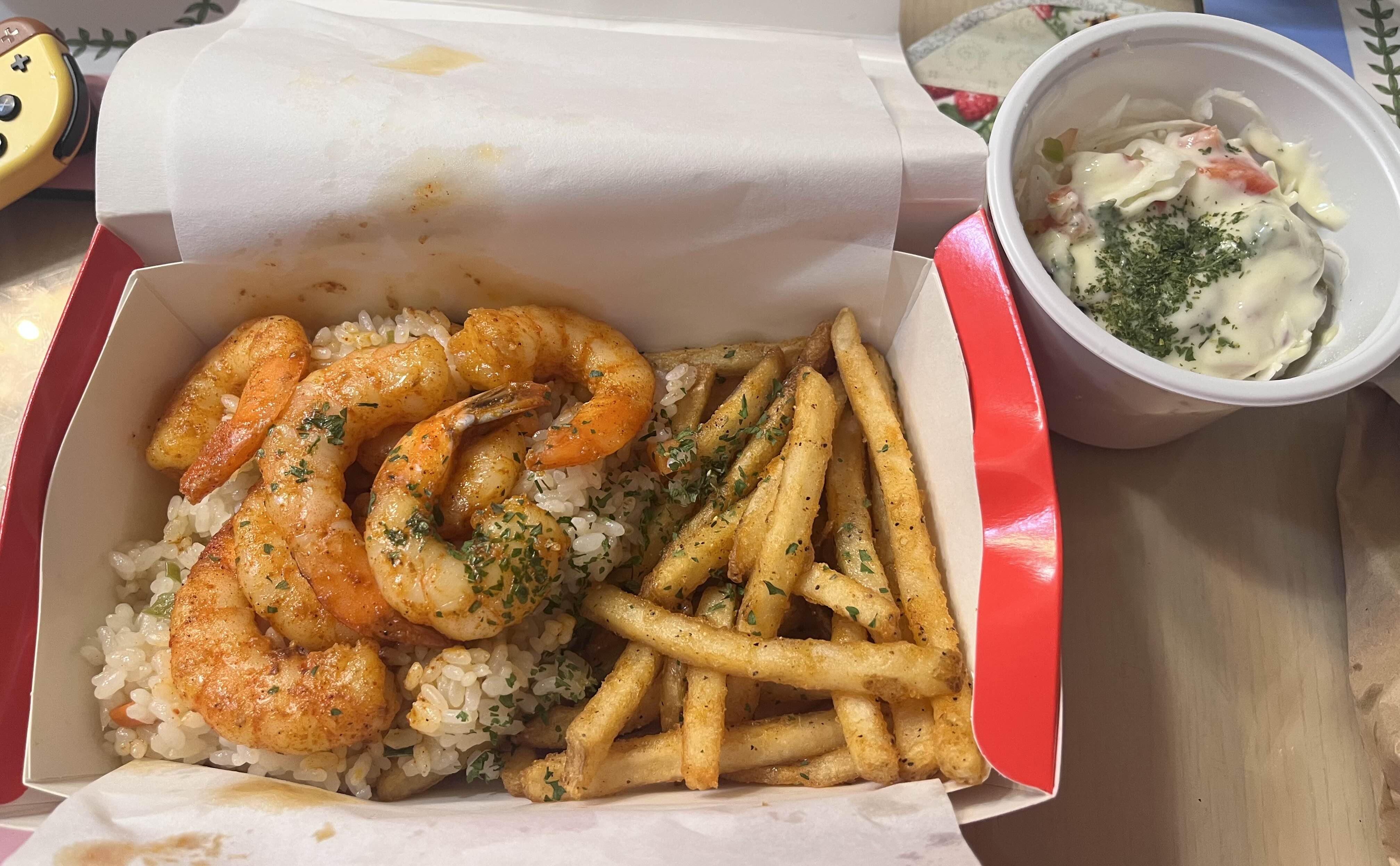 잘 양념된 맛있는 통통새우가 7마리, 감자튀김과 볶음밥,