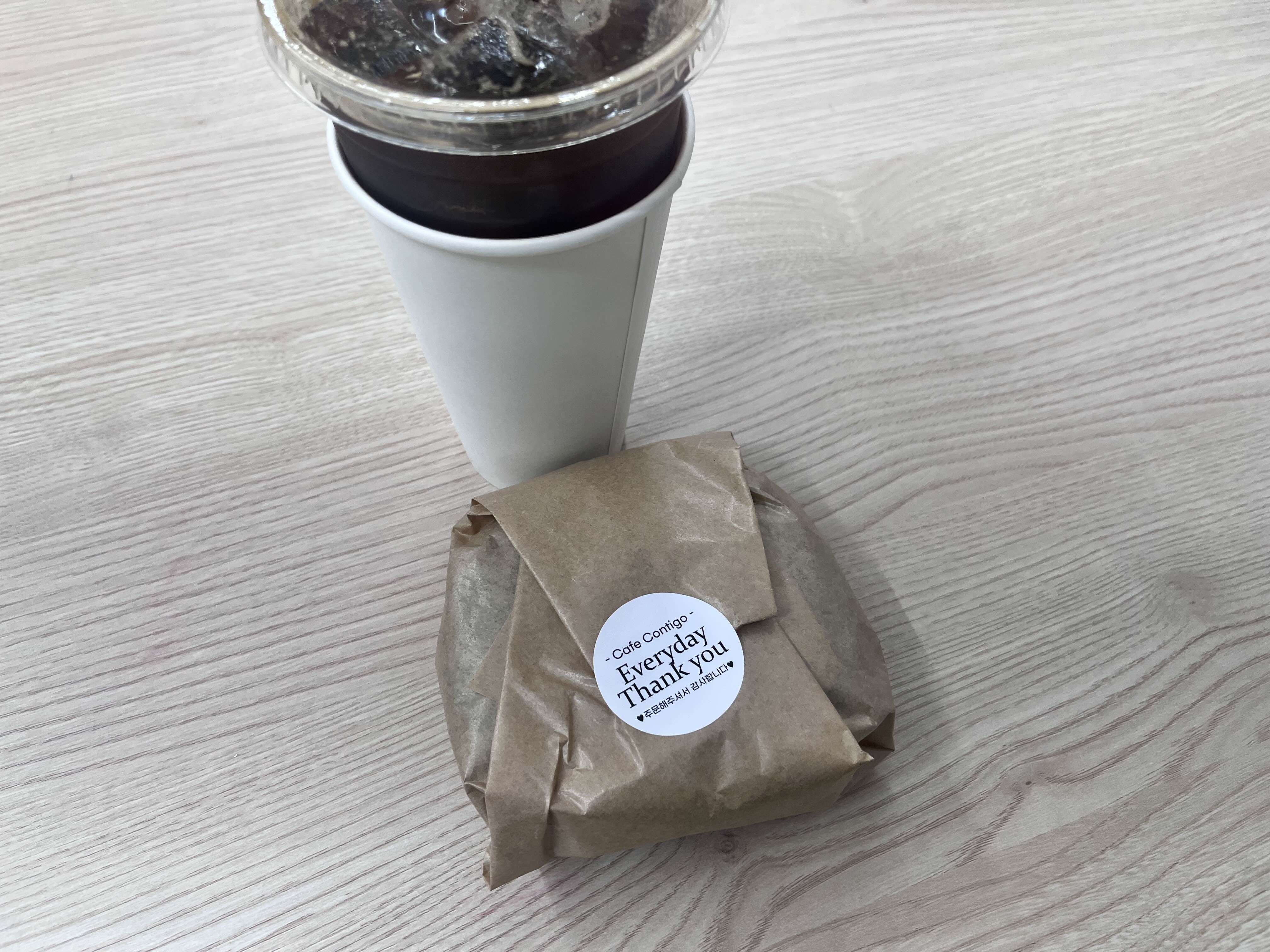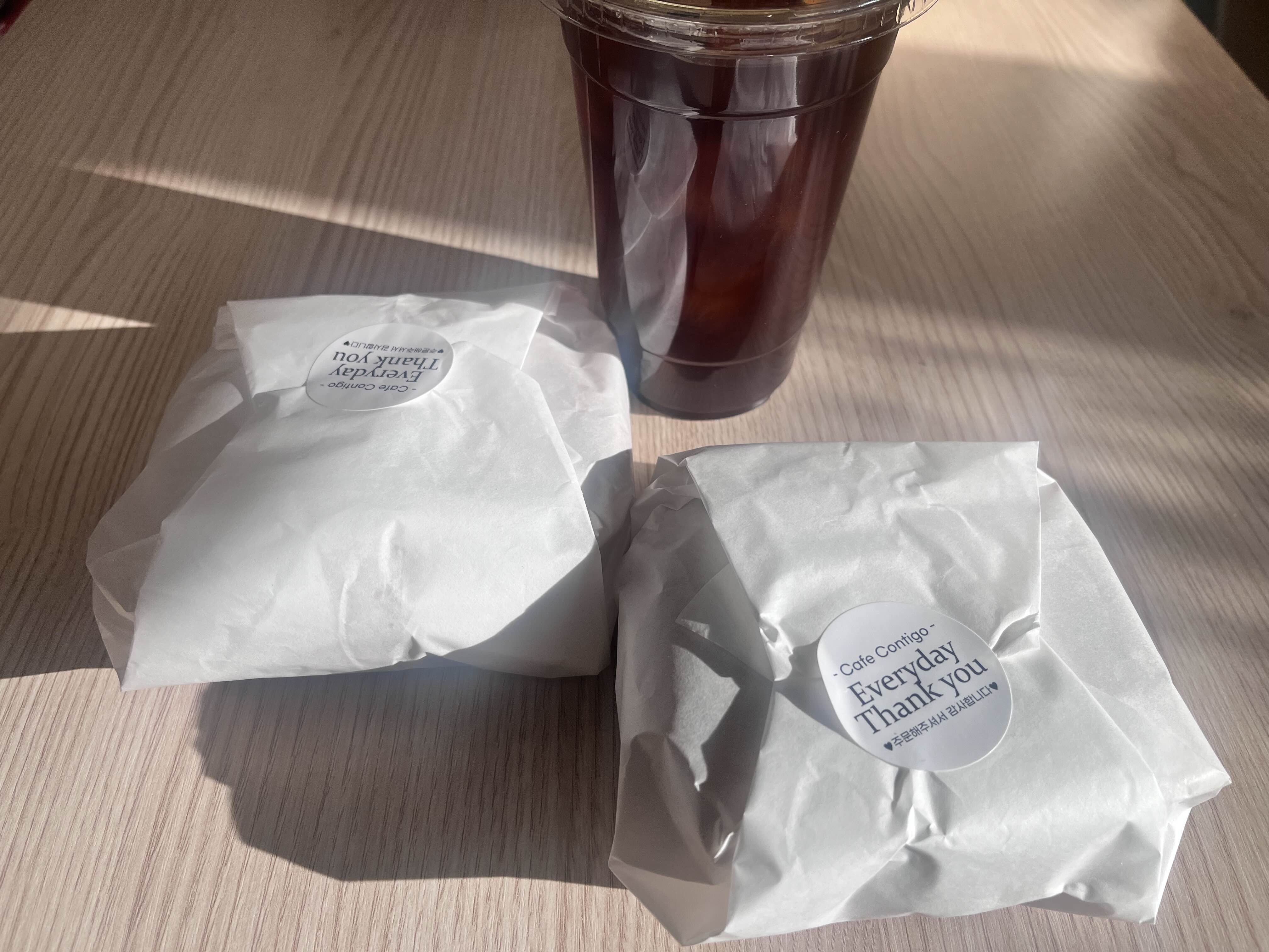 저의 최애 카페 컨티고 아이스 아메리카노랑 같이 먹물 베이글 테이크 아웃해왔어요.