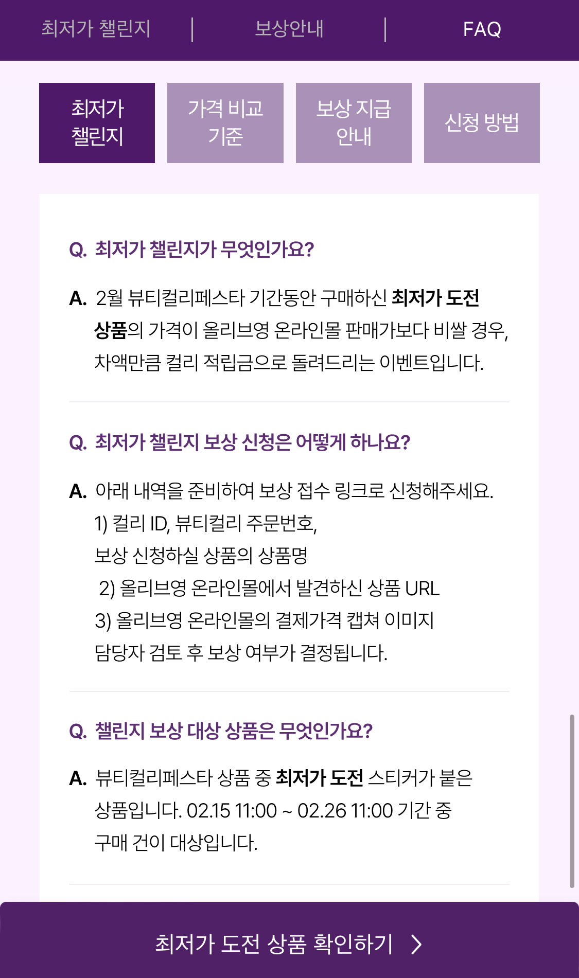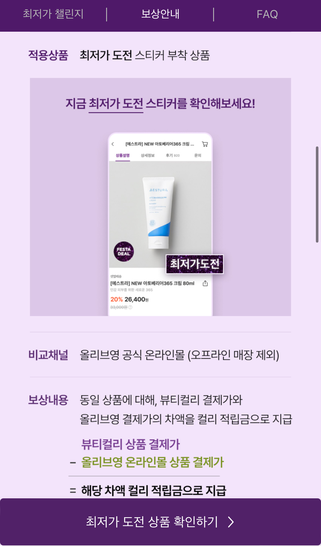 최저가도전 스티커가 붙은 상품에는 보상 이벤트까지 만들어 놨어요.