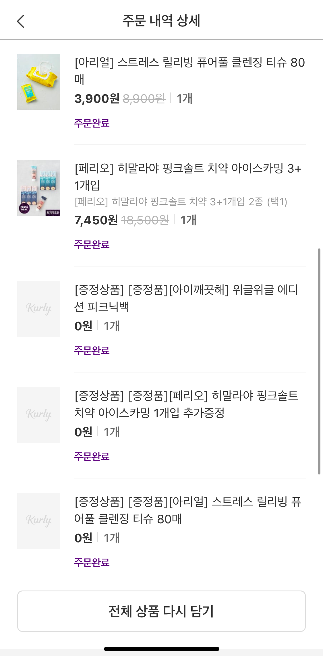 주문 목록에서 위글위글 피크닉백 증정여부 확인