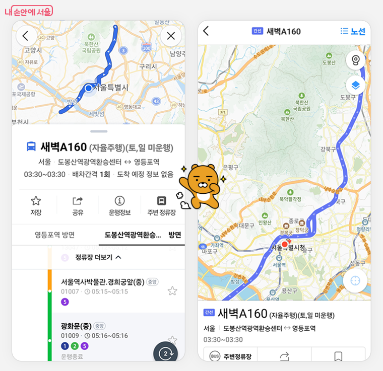 - 운행 시간 평일(월~금): 새벽 3시 30분 도봉산역 광역환승센터 출발