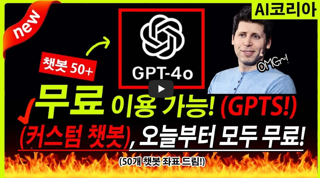 (124) [속보] GPT-4o (OpenAI) GPTS 모두 무료!!! 오픈! 50+ GPTS 챗봇 좌표! 이 영상으로 지금 확인하세요! - YouTube