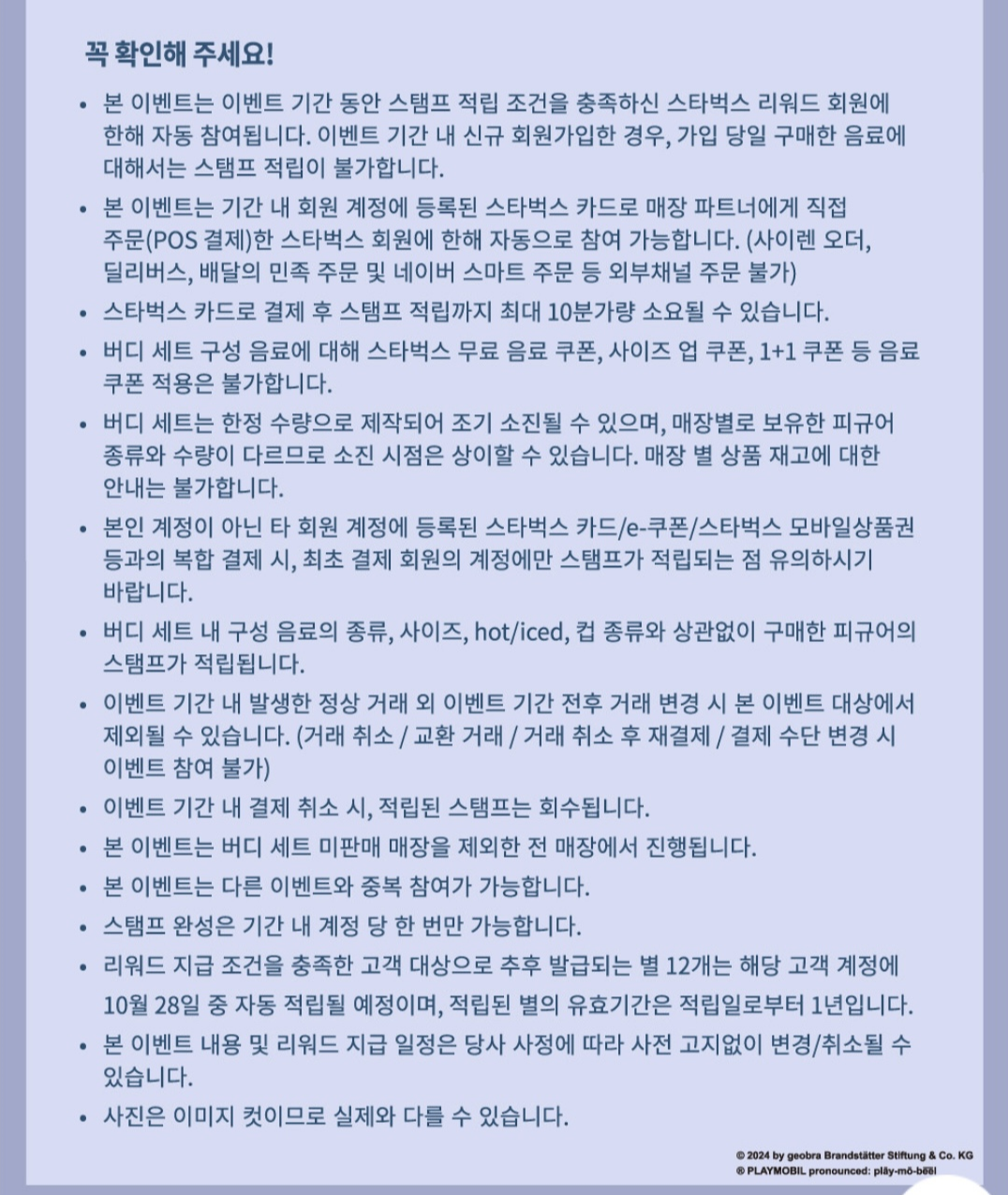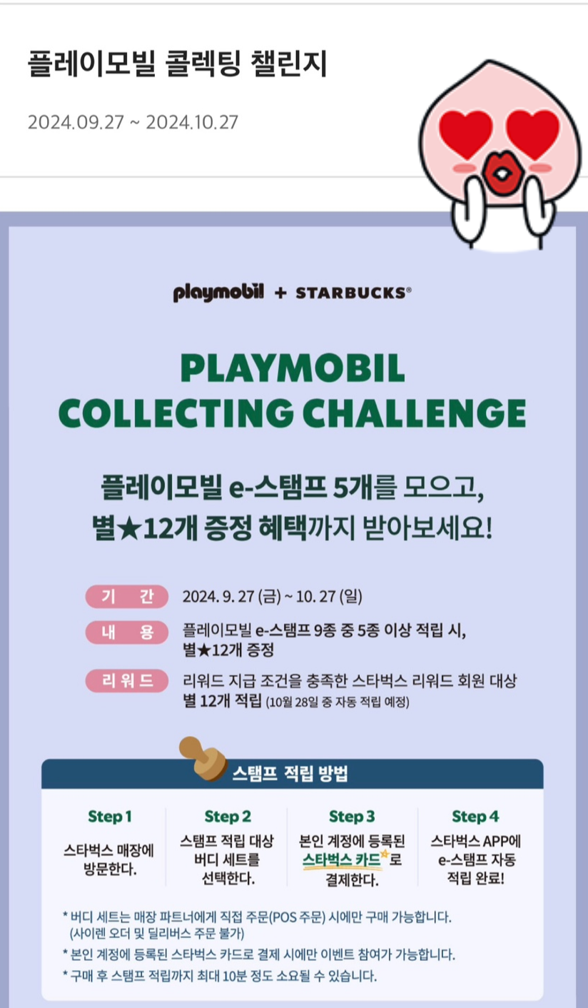 이벤트는 9월 28일부터 시작되며, 10월 21일까지 진행돼요. 참여 방법은 간단해요. 스타벅스 매장에서 특정 음료를 구매하면, 플레이모빌 스탬프를 받을 수 있어요. 5개의 스탬프를 모으면 특별한 보상을 받을 수 있으니, 꼭 참여해보세요!