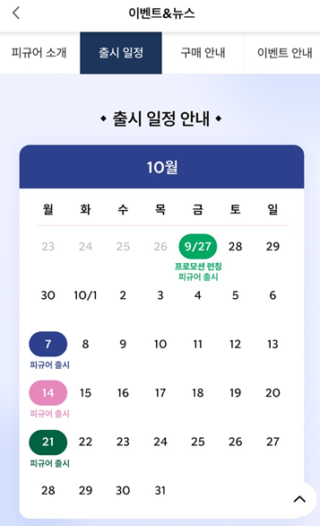 이 이벤트는 9월 28일부터 10월 21일까지 진행되며, 날짜별로 다른 피규어들이 준비되어 있어요.