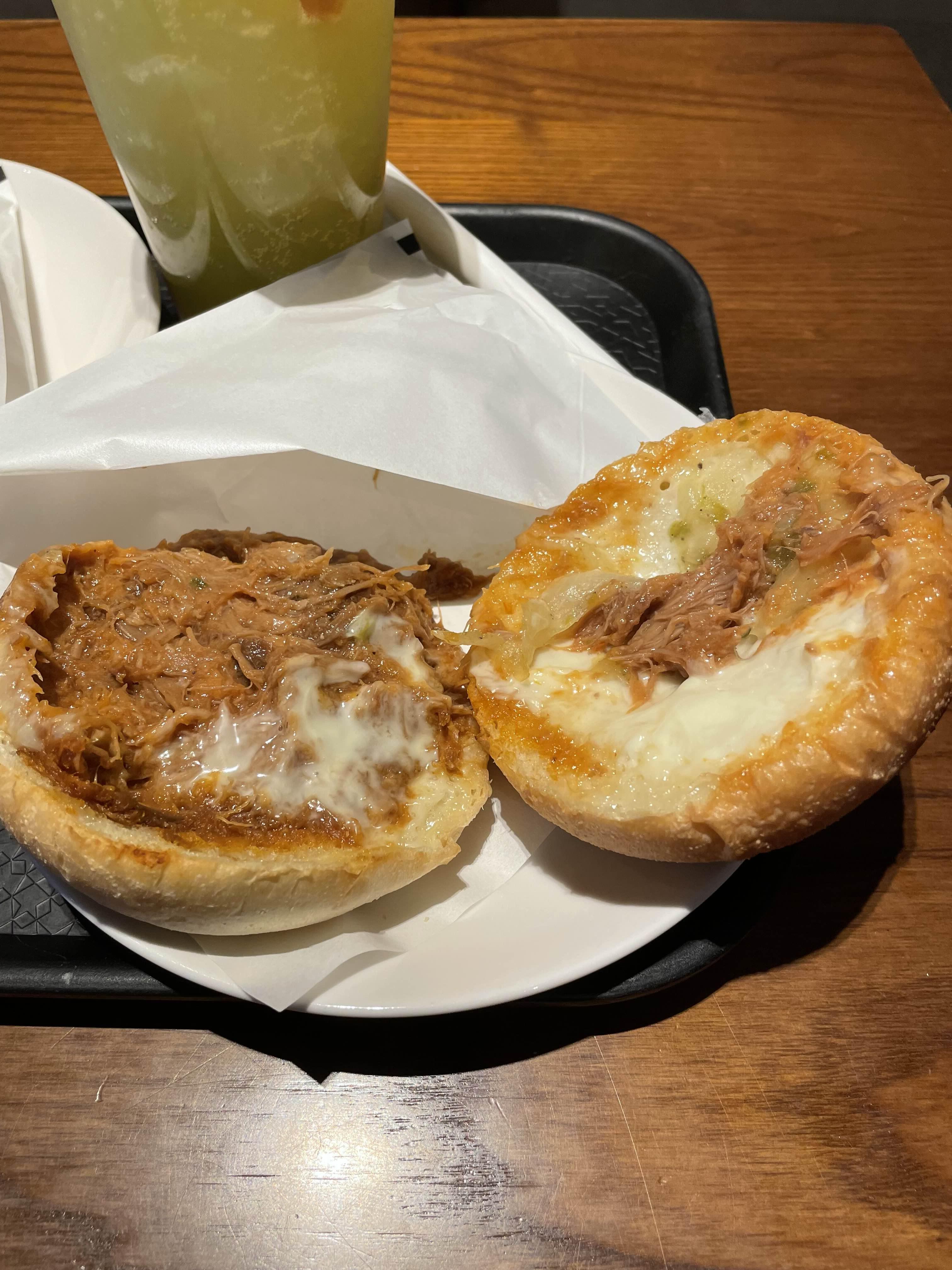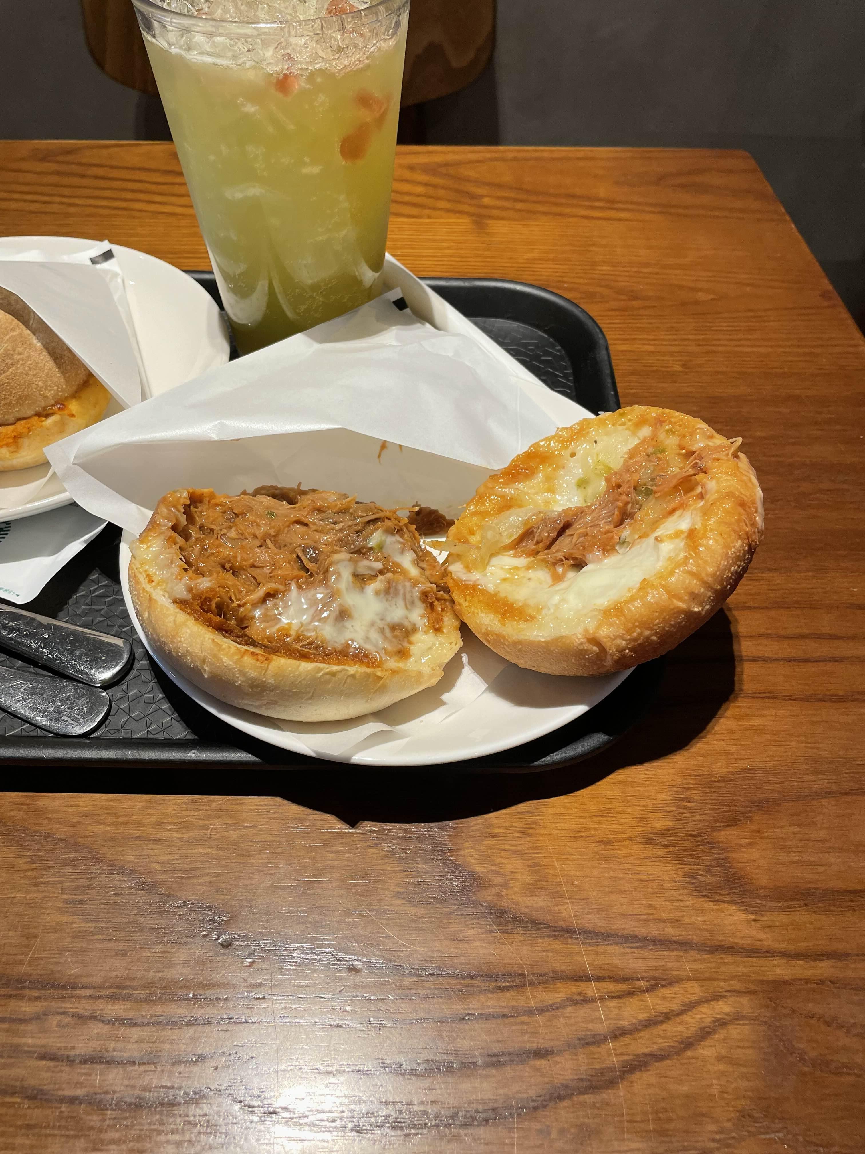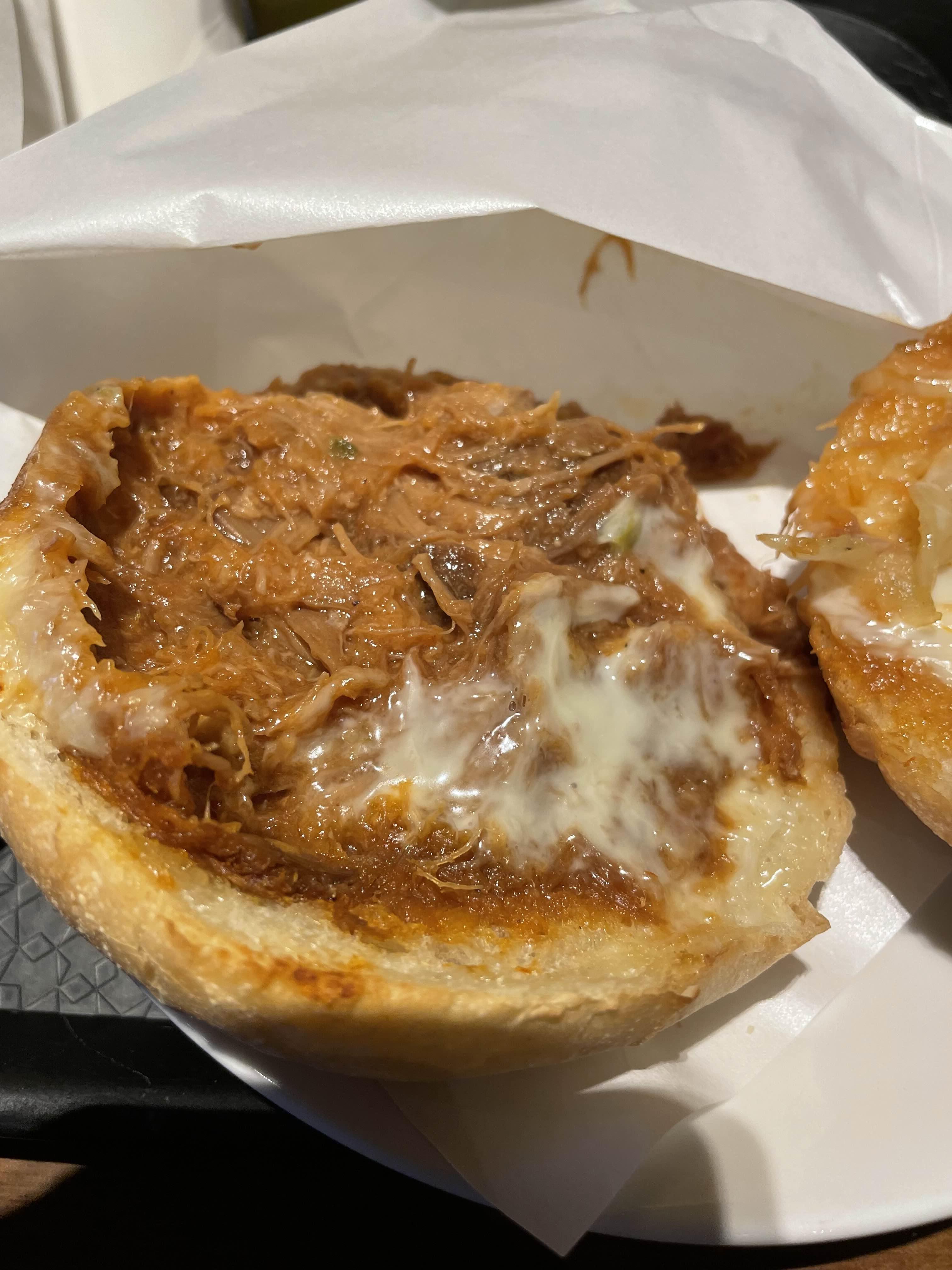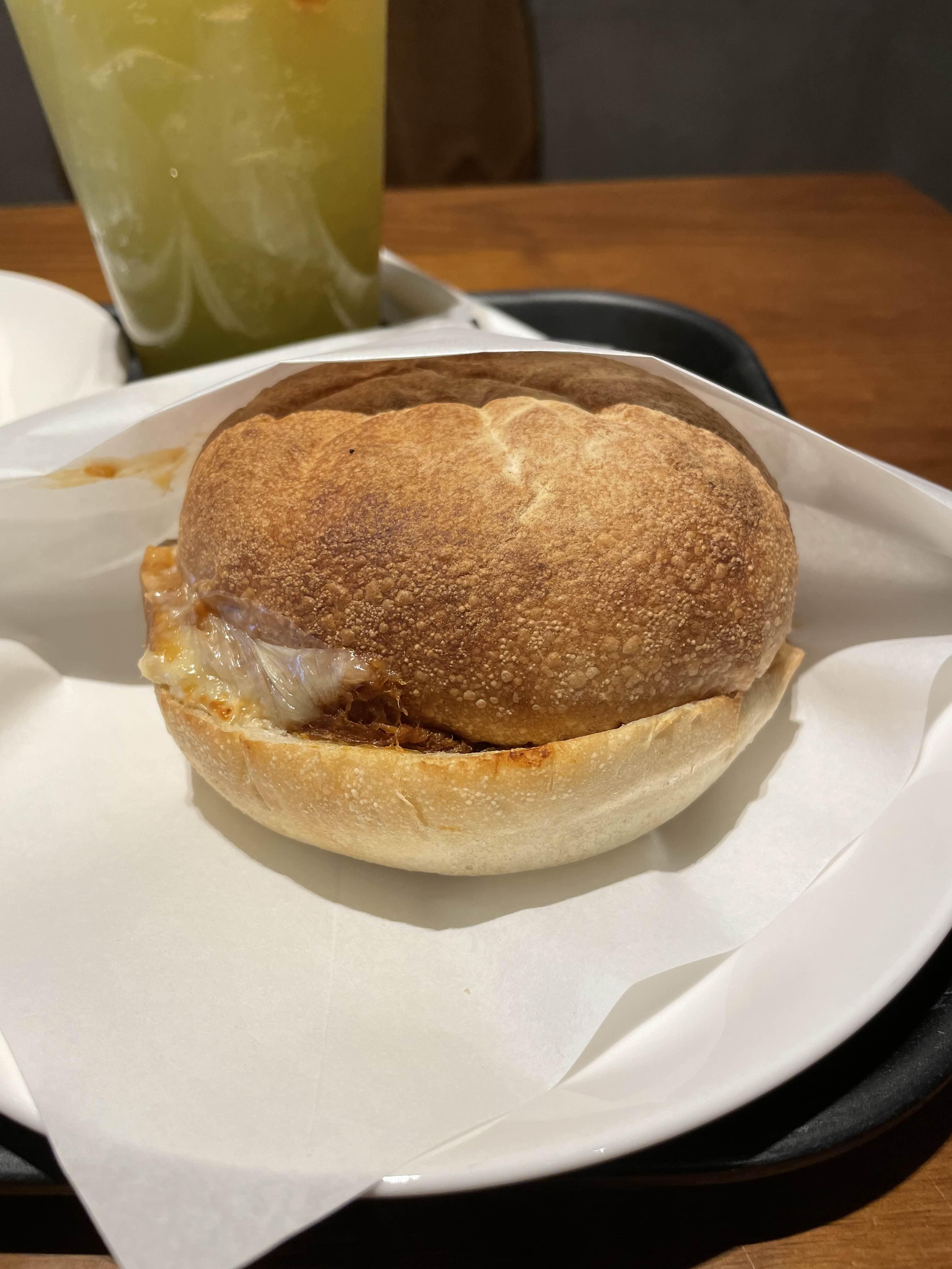 바삭한 바게트번에 풀드 포크와 구운양파,