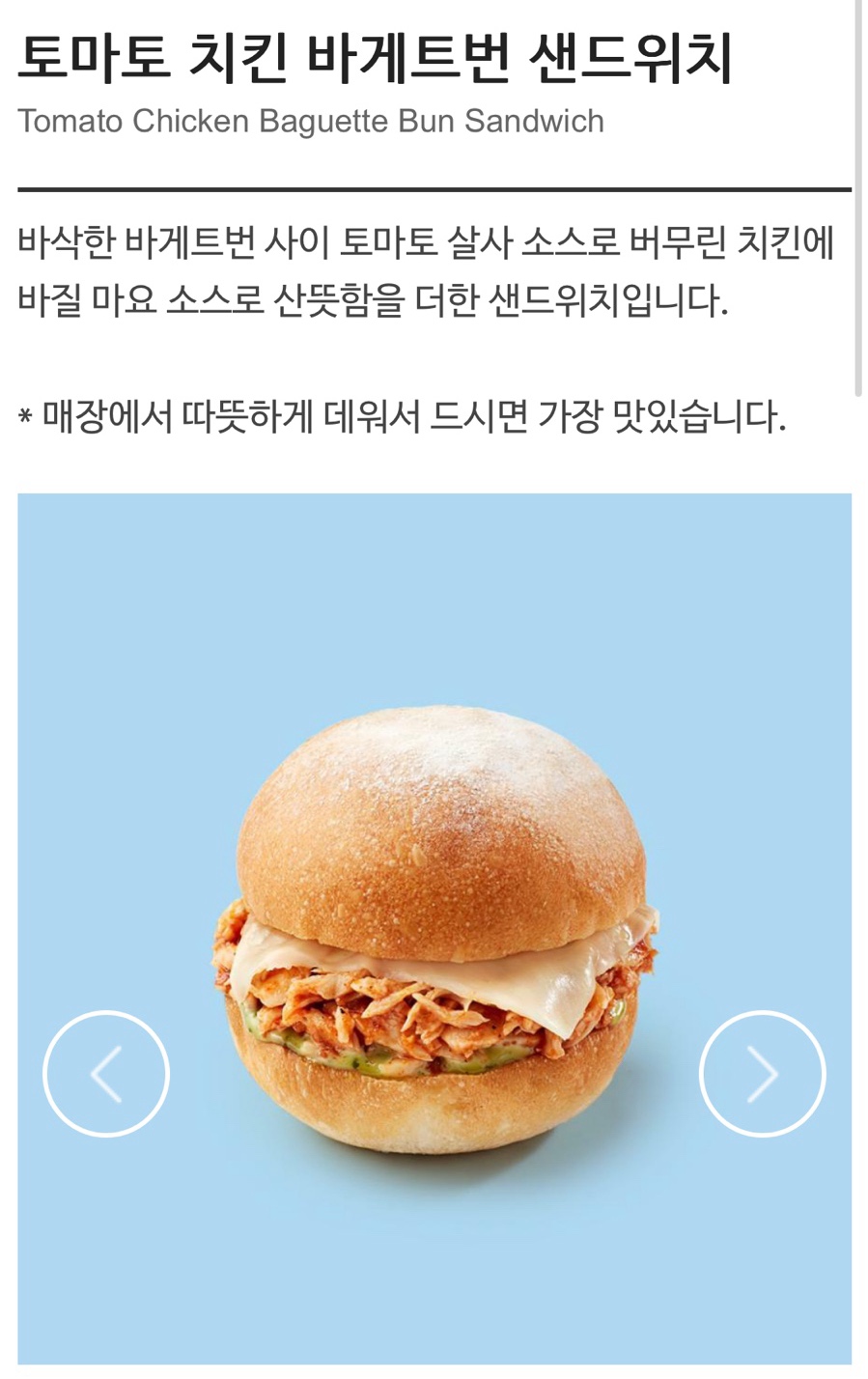 - 토마토 치킨 바게트번 샌드위치 7,300원