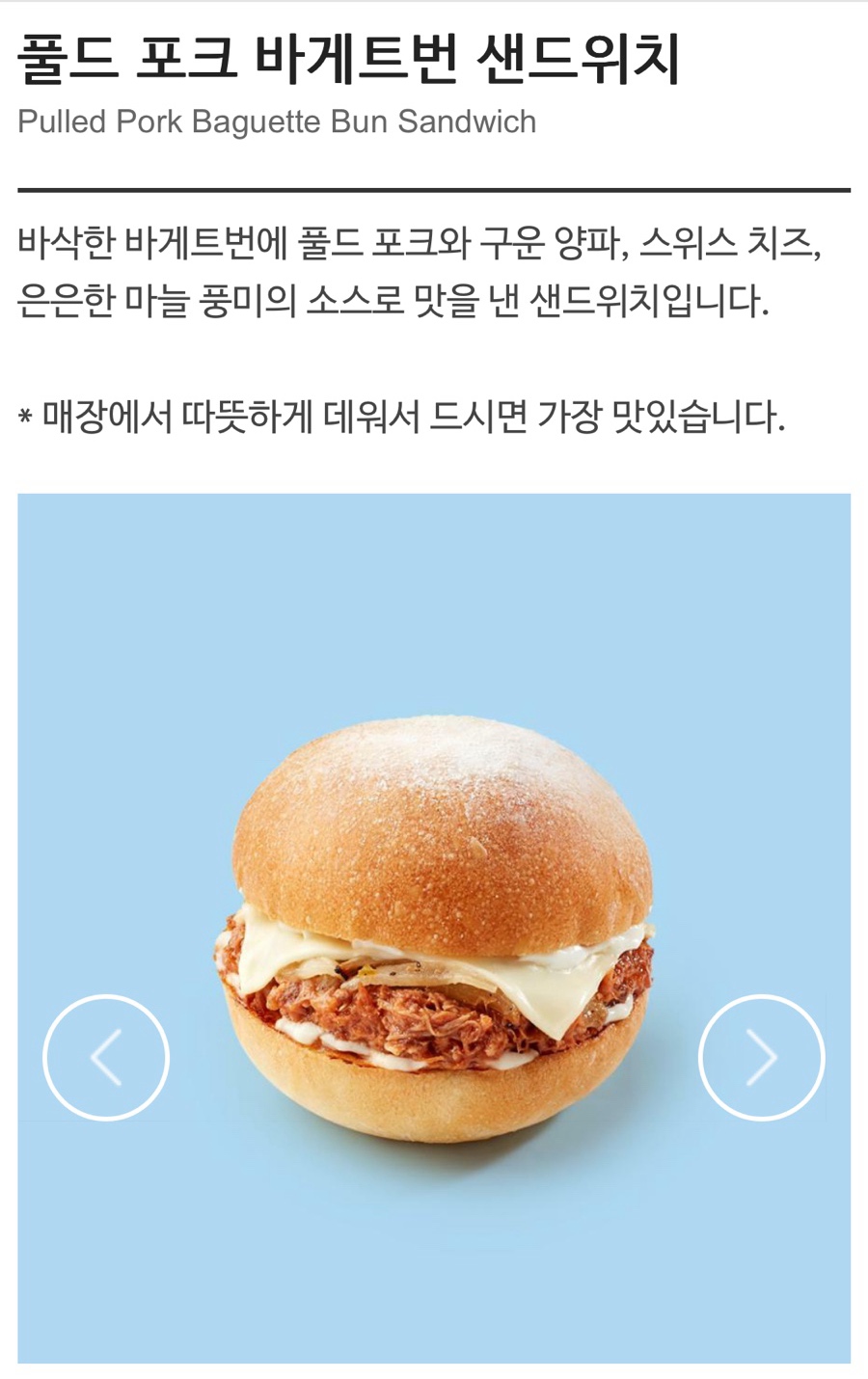 - 풀드 포크 바게트번 샌드위치 7,300원