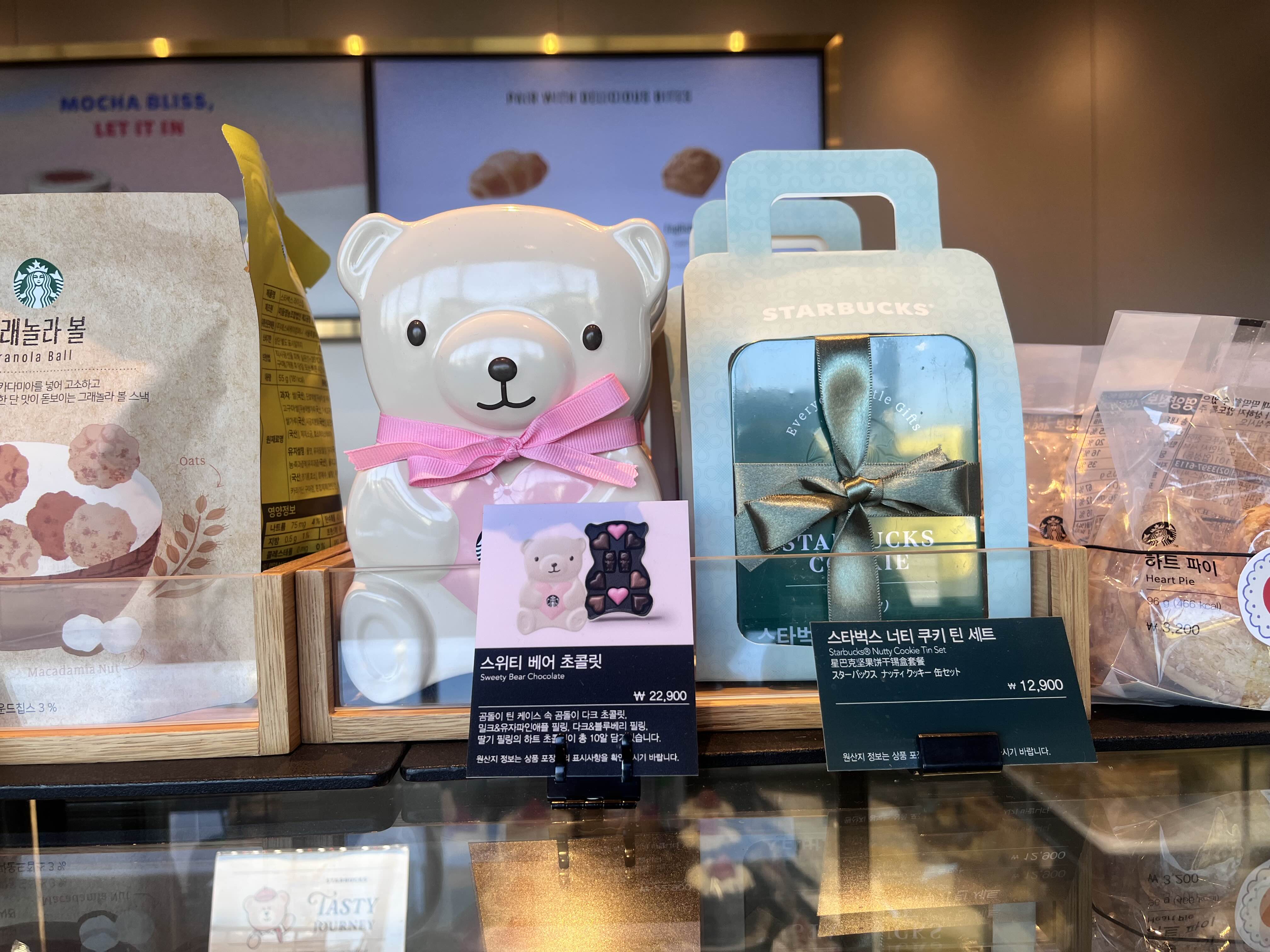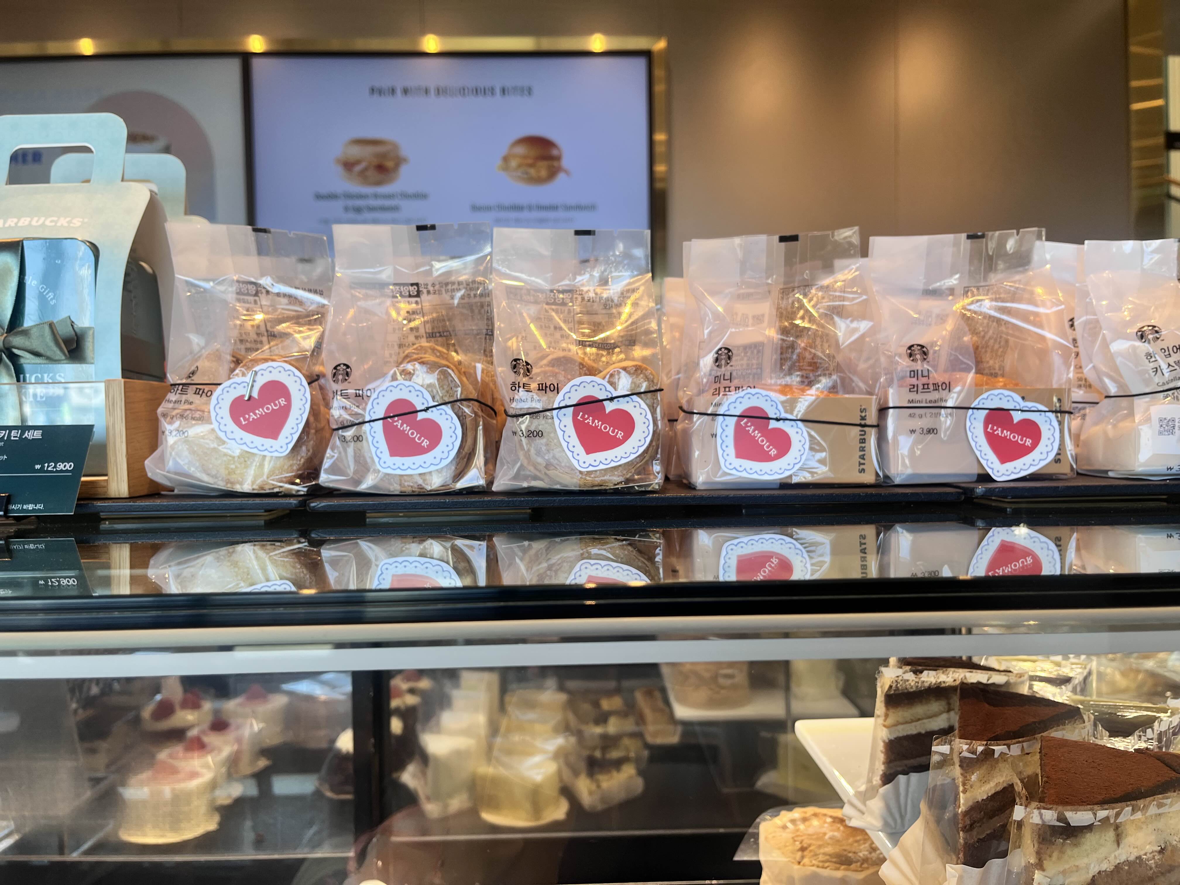 스타벅스 베이커리 코너에는 발렌타인데이 테마로 하트 포장이 추가된 제품들이 많았어요. 이런 작은 디테일이 기분을 더 좋게 만들어주는 것 같아요.
