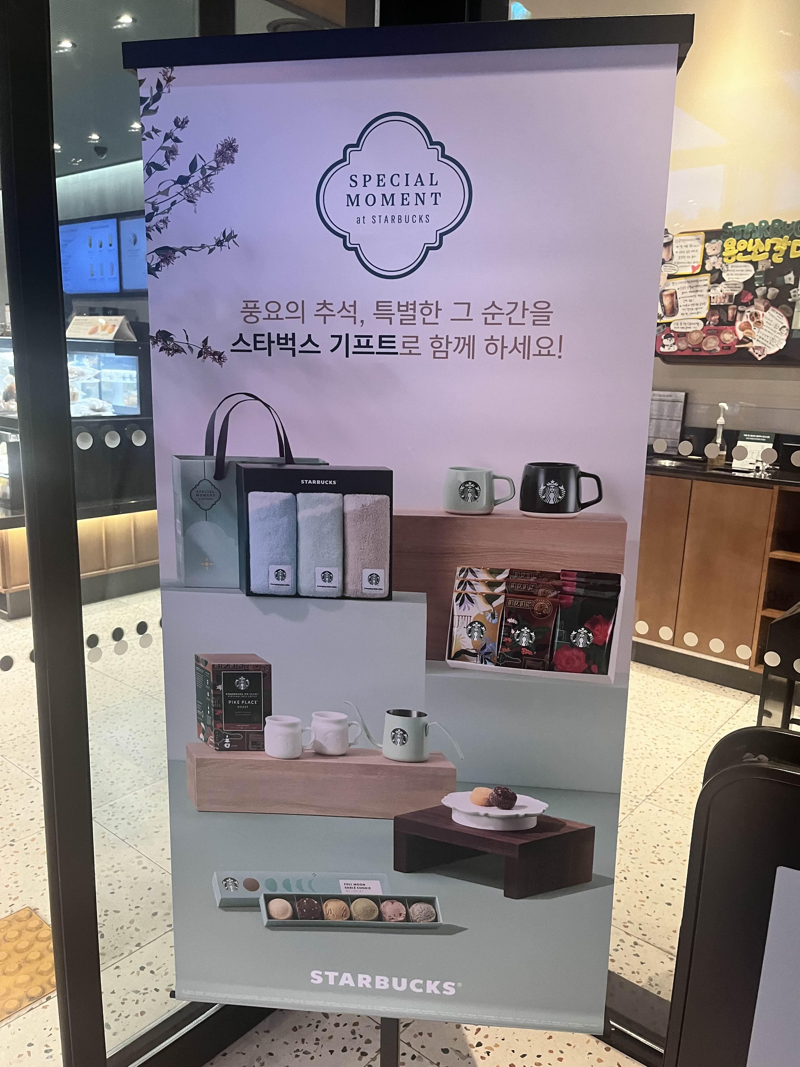 그래도 그 비를 뚫고 간 스타벅스에 입구에 추석 선물 배너가 크게 보여요.