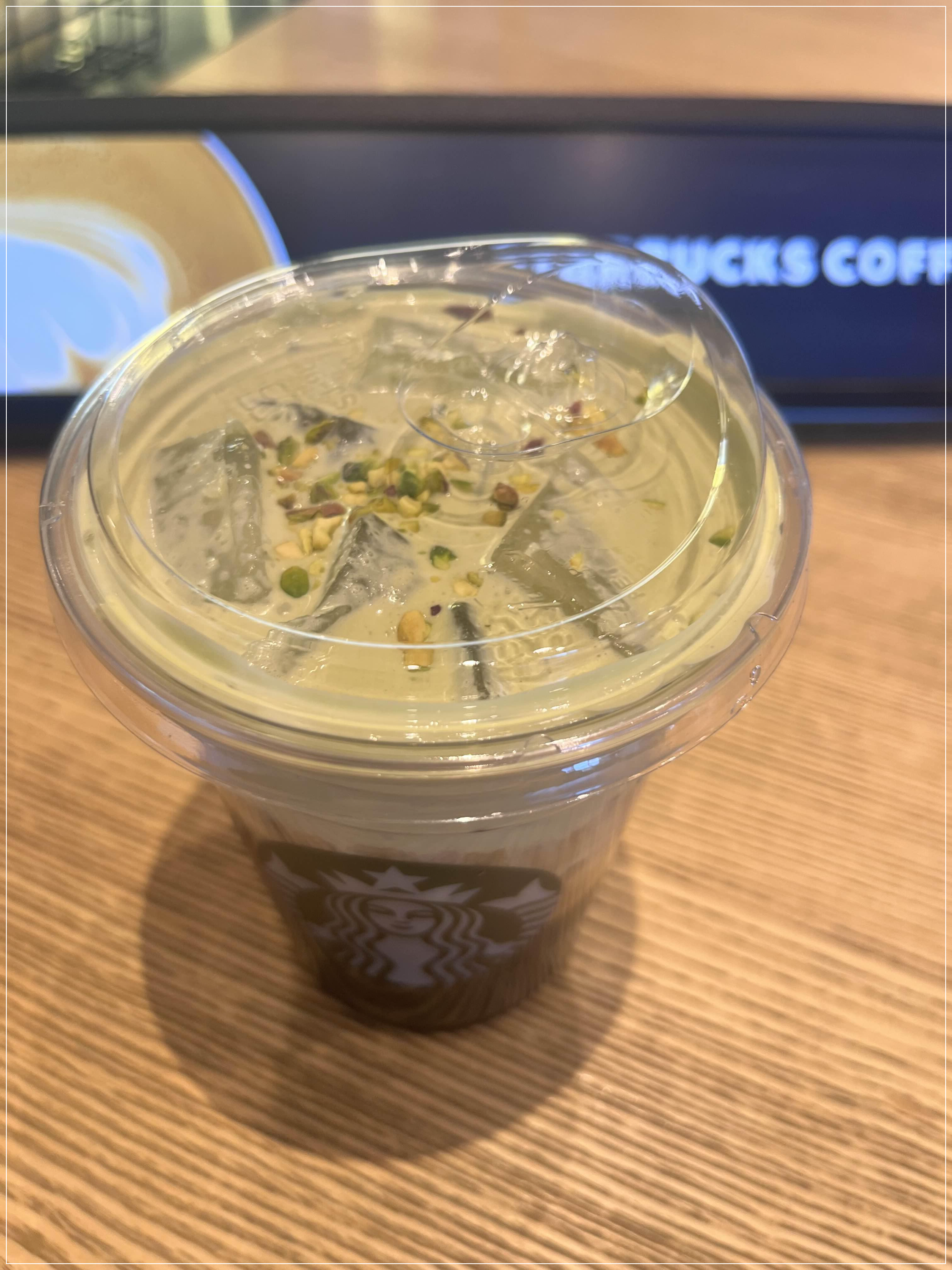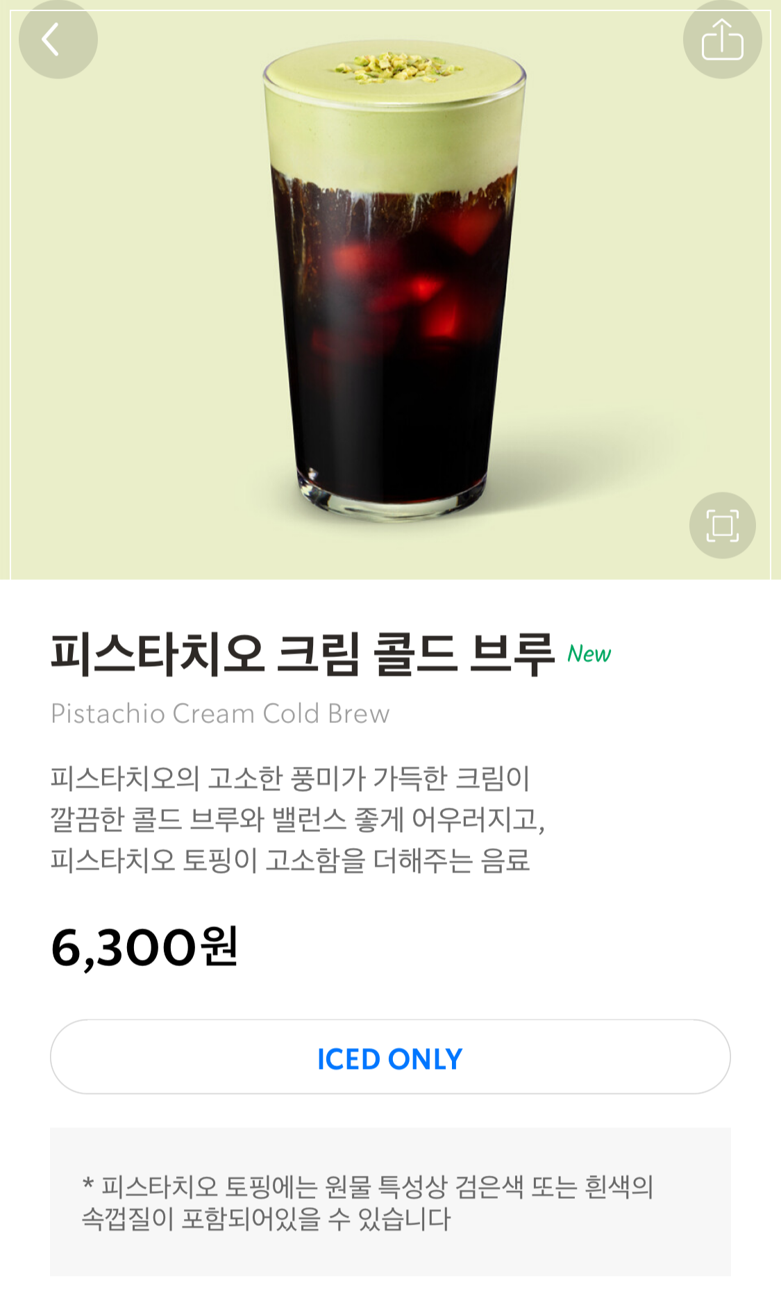 피스타치오 토핑이 고소함을 더해주는 음료"라고 설명되어 있어요.