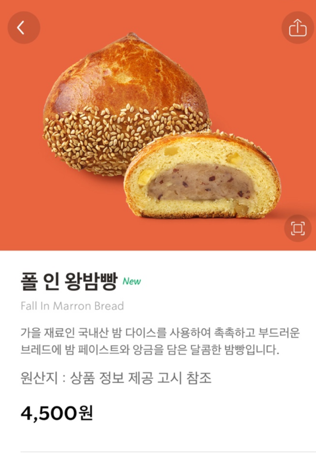 폴 인 왕밤빵은 4,500원 으로 판매되고 있어요. 겉모습은 둥글고 귀여운 형태로, 고소한 밤향기가 솔솔 나네요! 깨를 아랫쪽에 붙여서 완전 귀여운 밤 모양을 만들었어요 ㅎㅎ