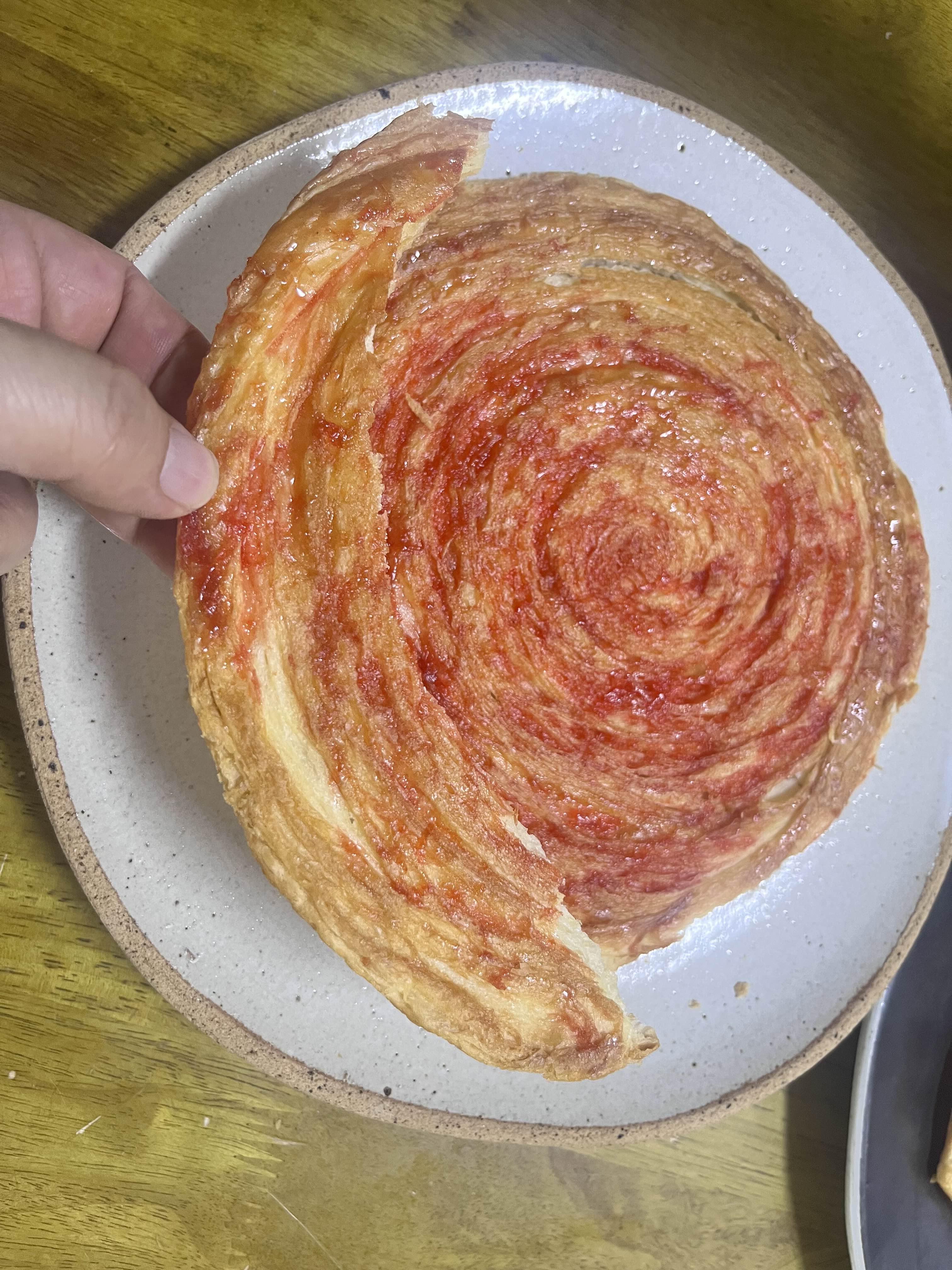 패스츄리 반죽을 납작하게 눌러 구운 매력적인 크로아상이예요.