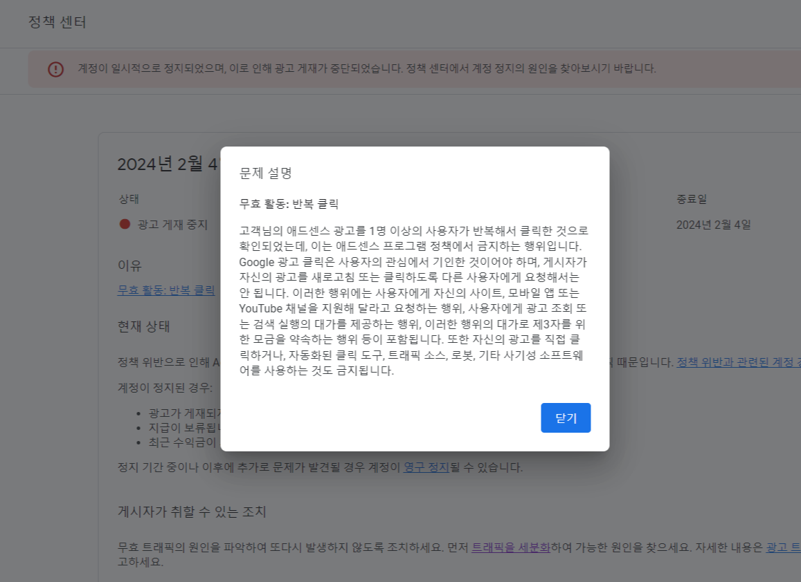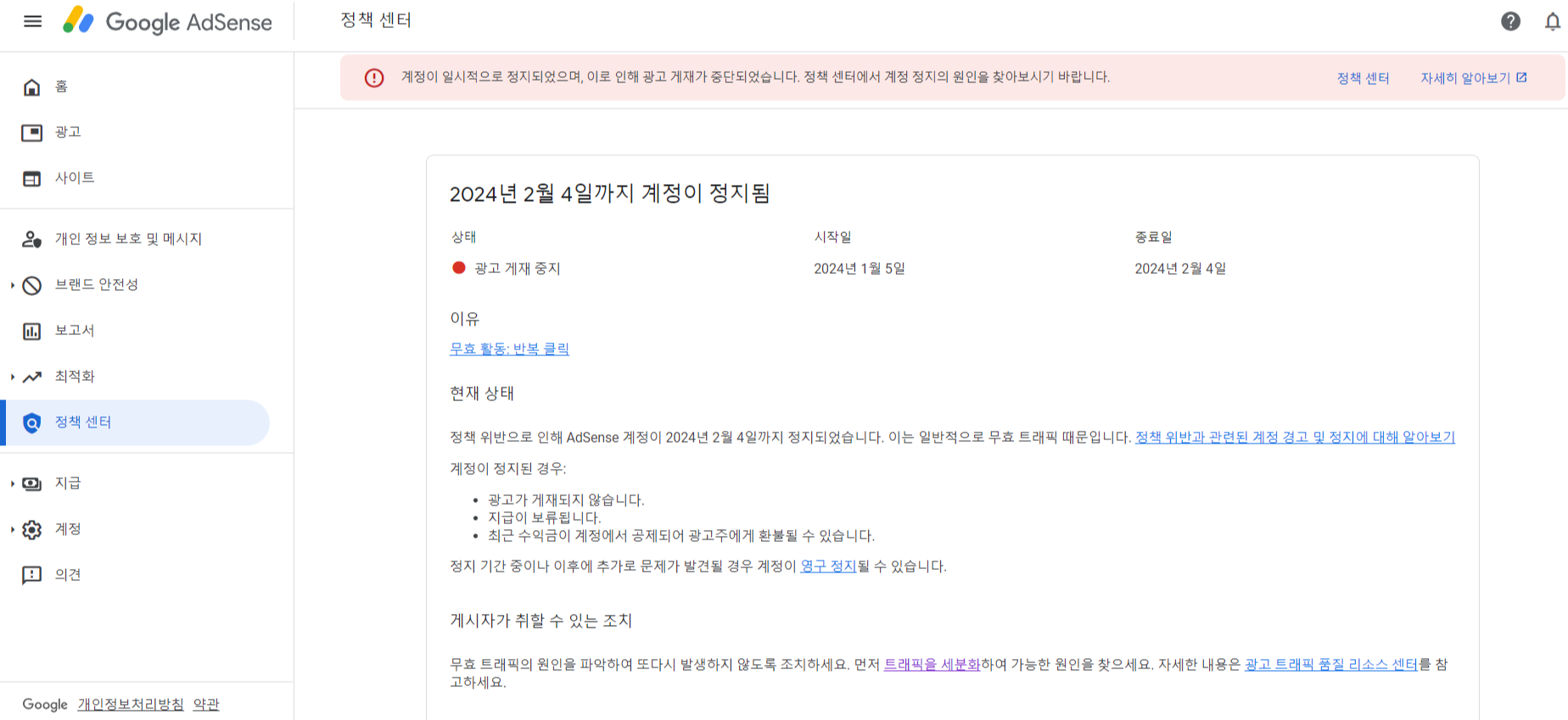 1월 5일부터 30일간 애드센스 계정이 일시적으로 정지되었대요.