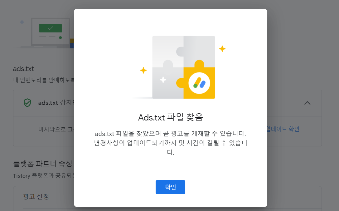 그러면 아래 사진처럼 'Ads.txt 파일 찾음' 이라는 반가운 팝업창이 뜰거예요.