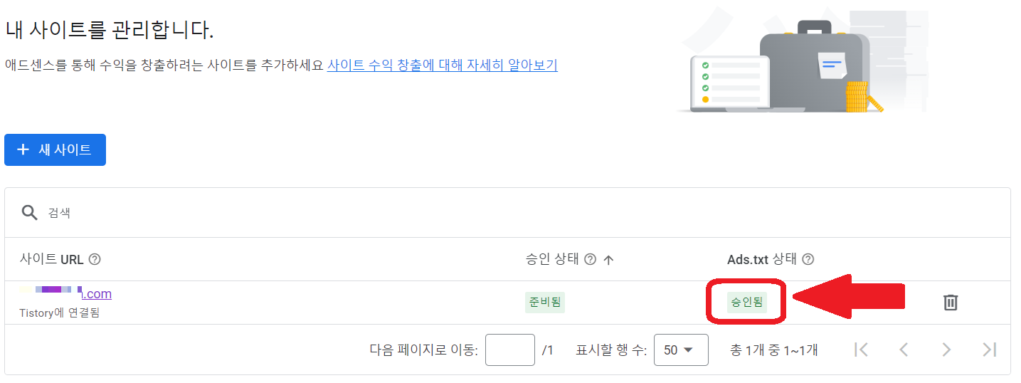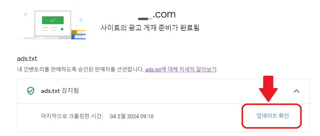 Ads.txt 상태가 '찾을 수 없음'에서 '승인됨'으로 바뀌었어요.