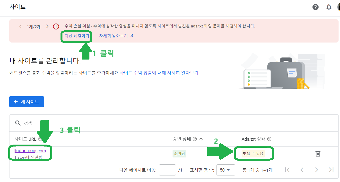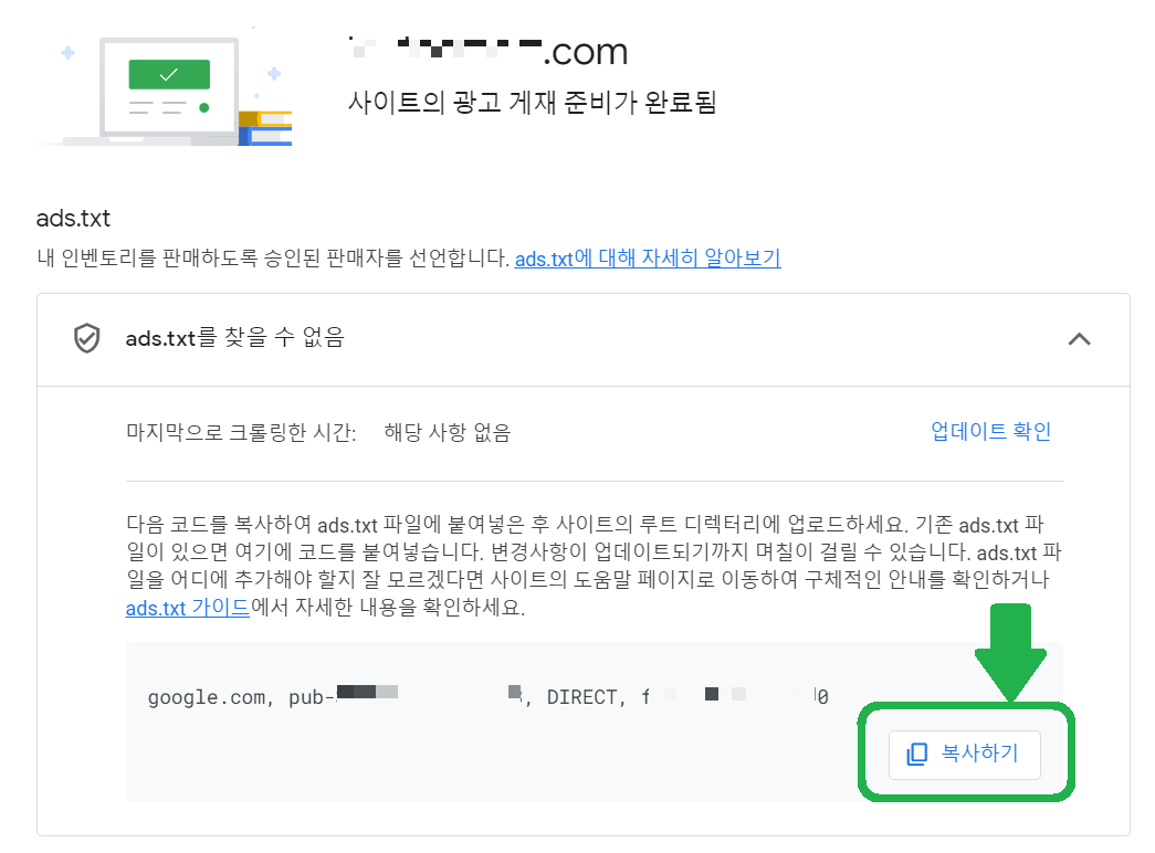 2. Ads.txt 상태가 '찾을 수 없음'으로 보여집니다.