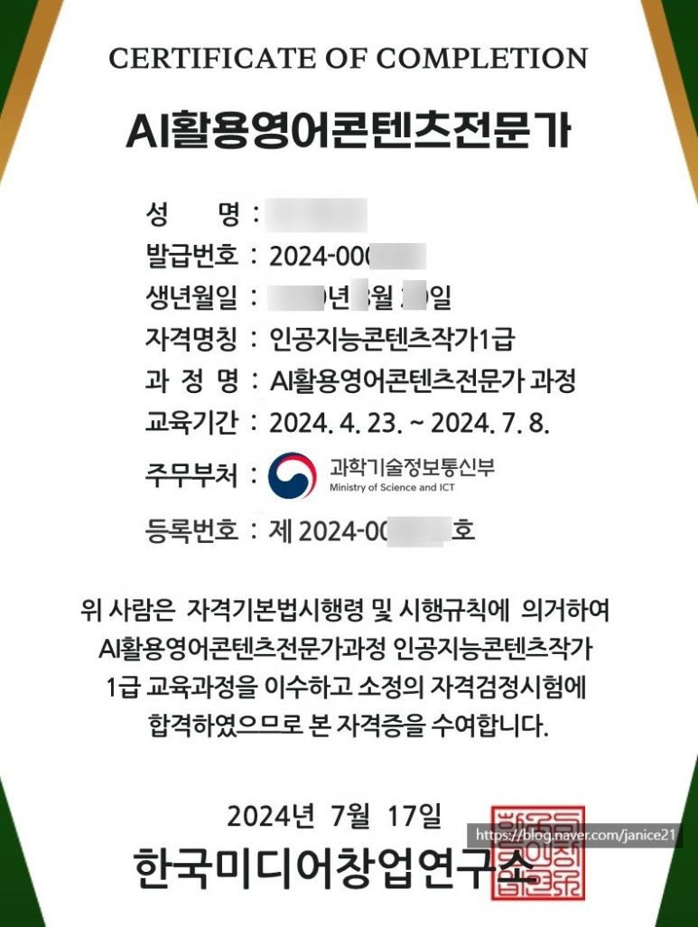 한국미디어창업연구소에서 시행한 AI활용영어콘텐츠전문가 과정 1급 자격증을 이수했어요!