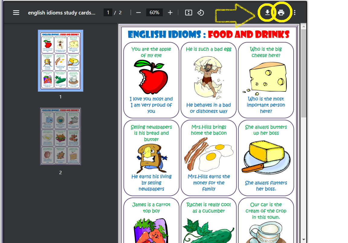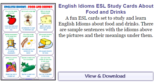A fun ESL cards set to study and learn English Idioms about food and drinks. There are sample sentences with the idioms above the pictures and their meanings under them.