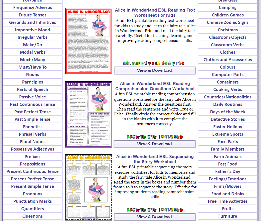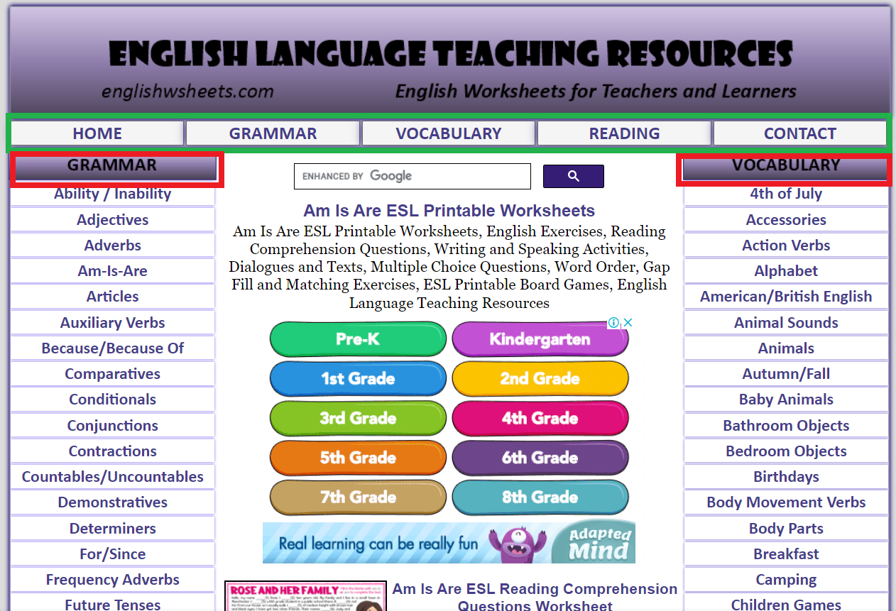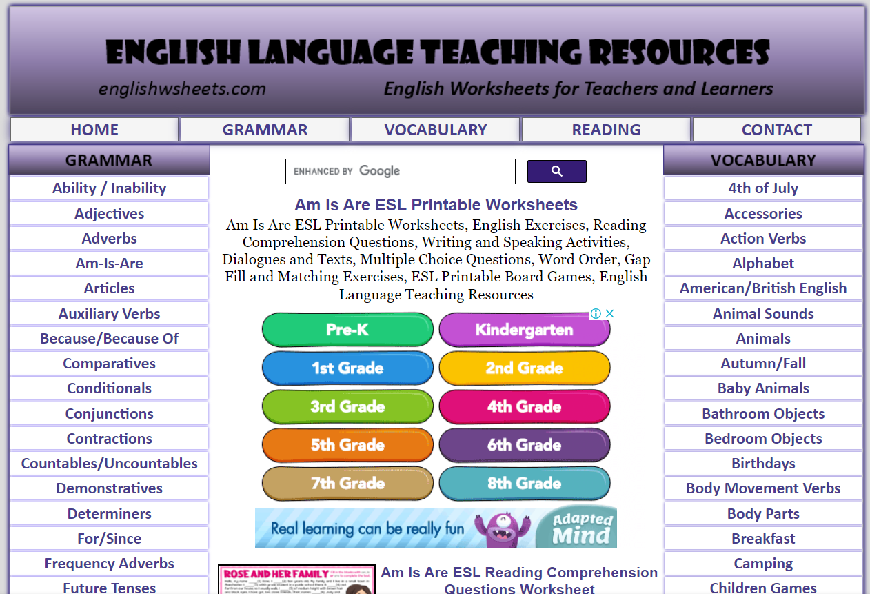 왼쪽에는 Grammar, Reading Comprehension, Math Worksheets, Writing Worksheets가 구성되어 있어요.