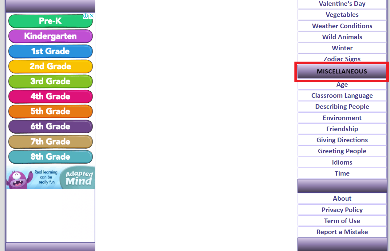 오른쪽 메뉴에는 Vocabulary와 Miscellaneous /미슬래니어스/ (여러 가지 종류의, 다양한)이 준비되어 있어요.