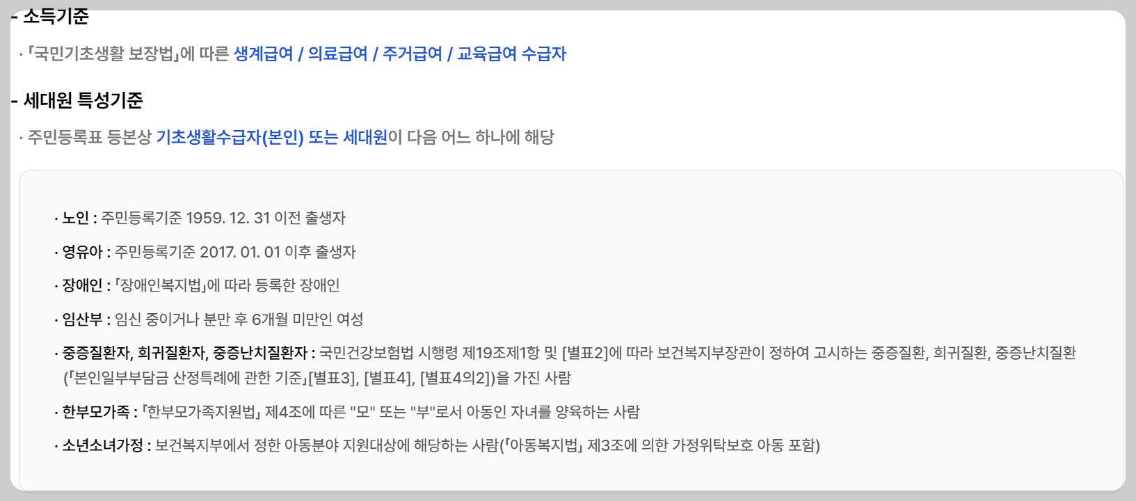 - 필요 서류: 신청서, 주민등록증, 소득증명원, 세대원관계도, 금융기관 계좌번호 확인서 등