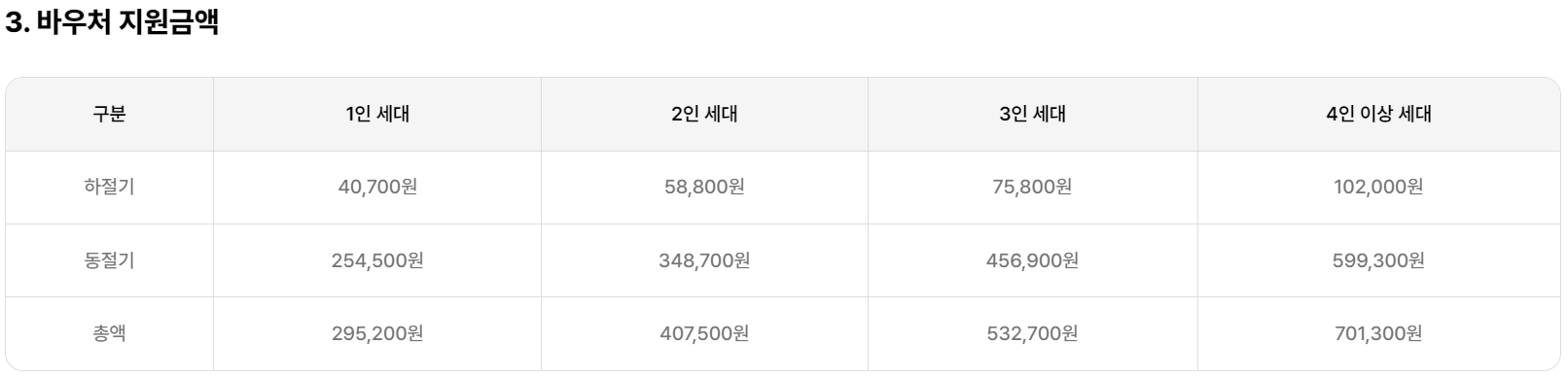 - 지역별 차등 지원: 에너지 바우처 지원 금액은 지역별로 차등이 적용됩니다