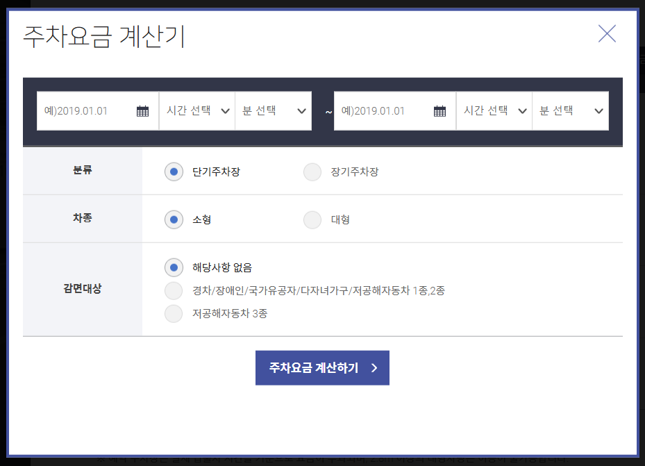 위의 화면 오른쪽 상단 빨간색 박스 '예상 주차요금 확인하기' 버튼을 누르면 주차요금을 미리 계산해줘요.