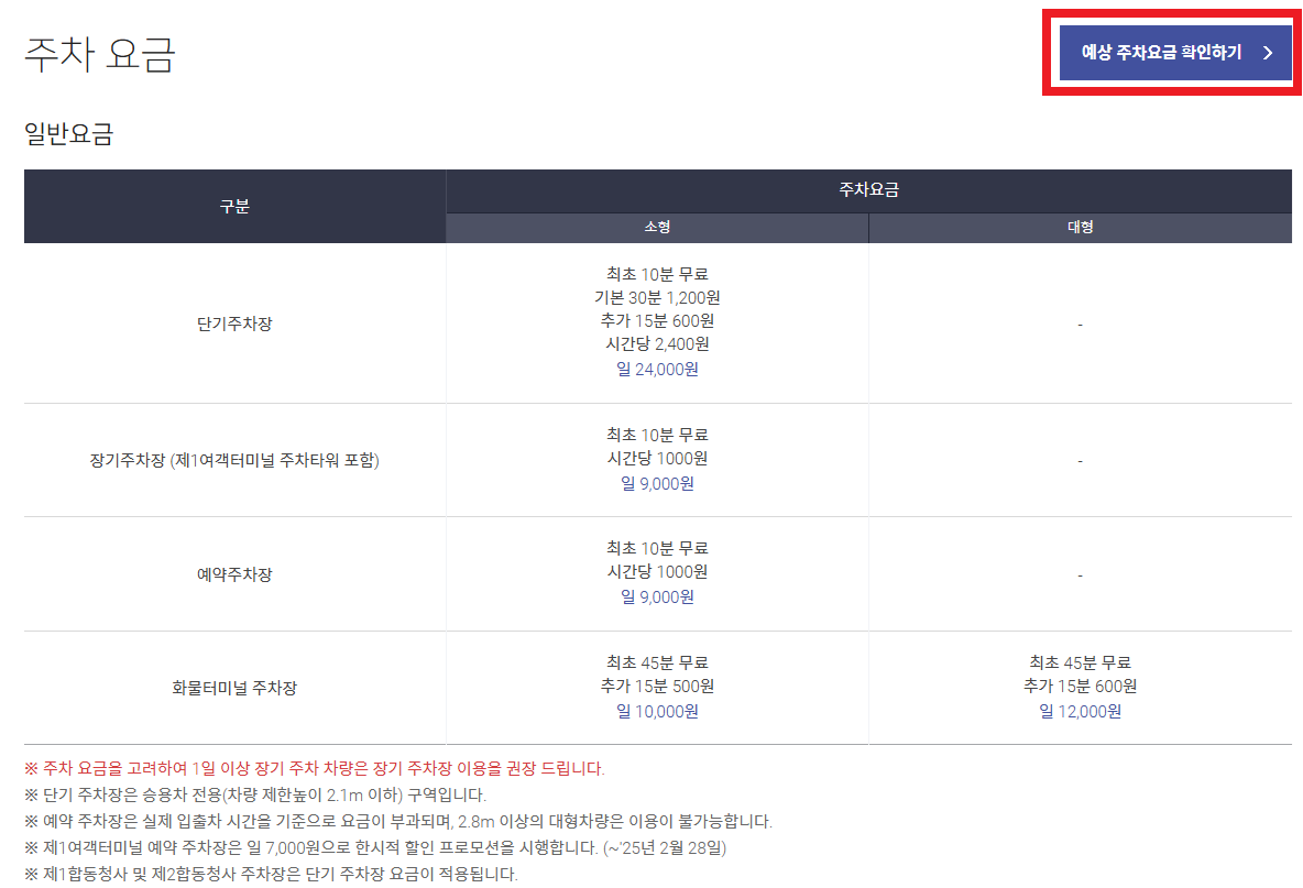 - 주차 위치: 장기 주차장, 민영 주차장은 공항 주차장보다 멀리 떨어져 있을 수 있습니다. (셔틀버스 운행 여부 확인)