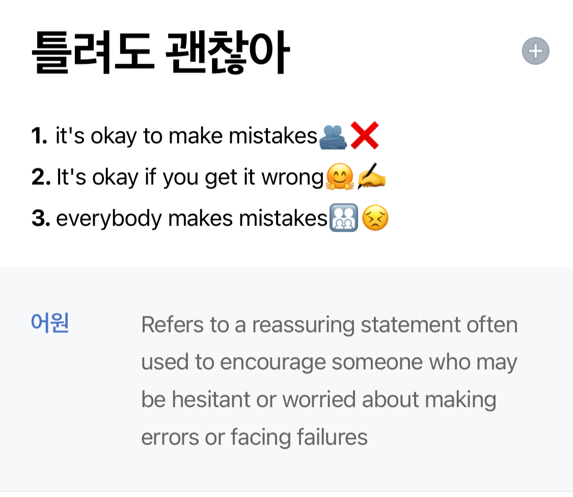 그래서 “틀려도 괜찮아”라는 말을 이렇게나 다양하게 표현하는 거예요.