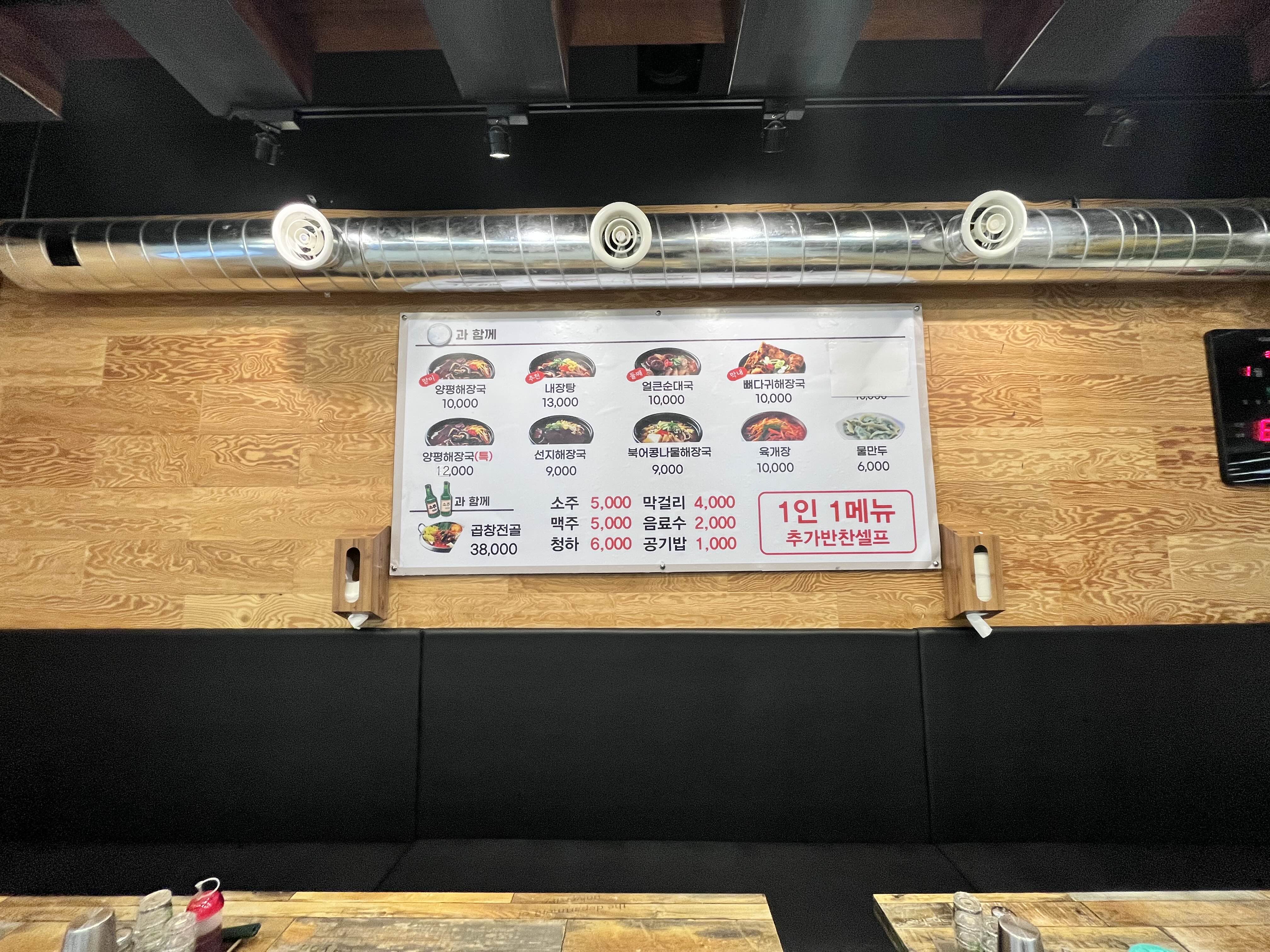 메뉴는 간단하게 해장국, 순대국, 북어콩나물국, 육개장, 곱창전골, 물만두