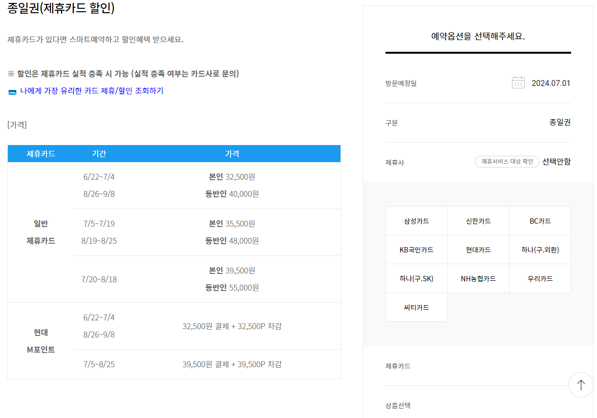 캐리비안 베이 입장권은 여러 카드사와 제휴하여 다양한 할인을 제공합니다. 아래 표는 2024년 7월 기준으로 카드사별 할인율과 금액을 정리한 것입니다.