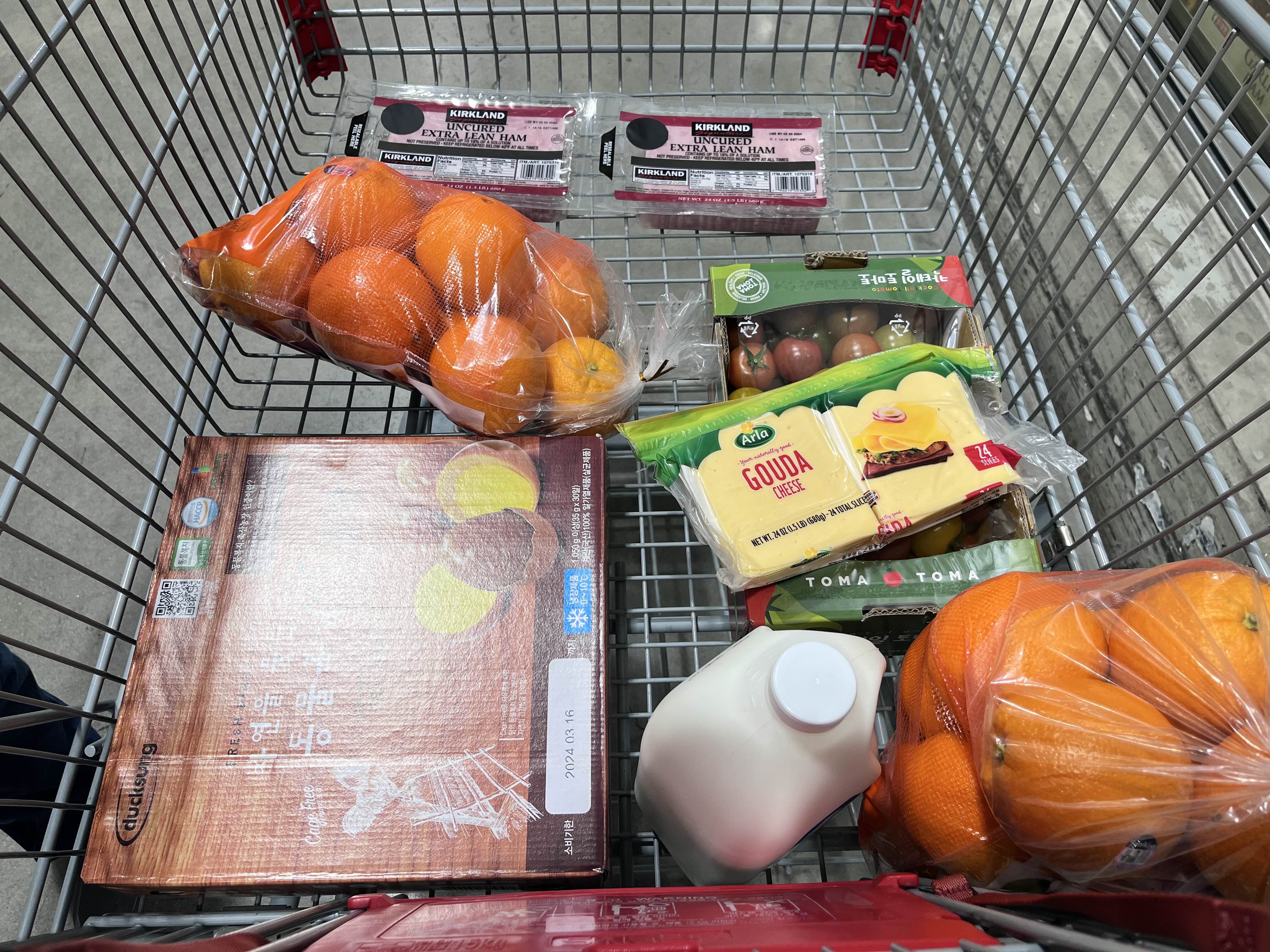과일이랑 샌드위치용 햄이랑 치즈 좀 사러 갔어요.