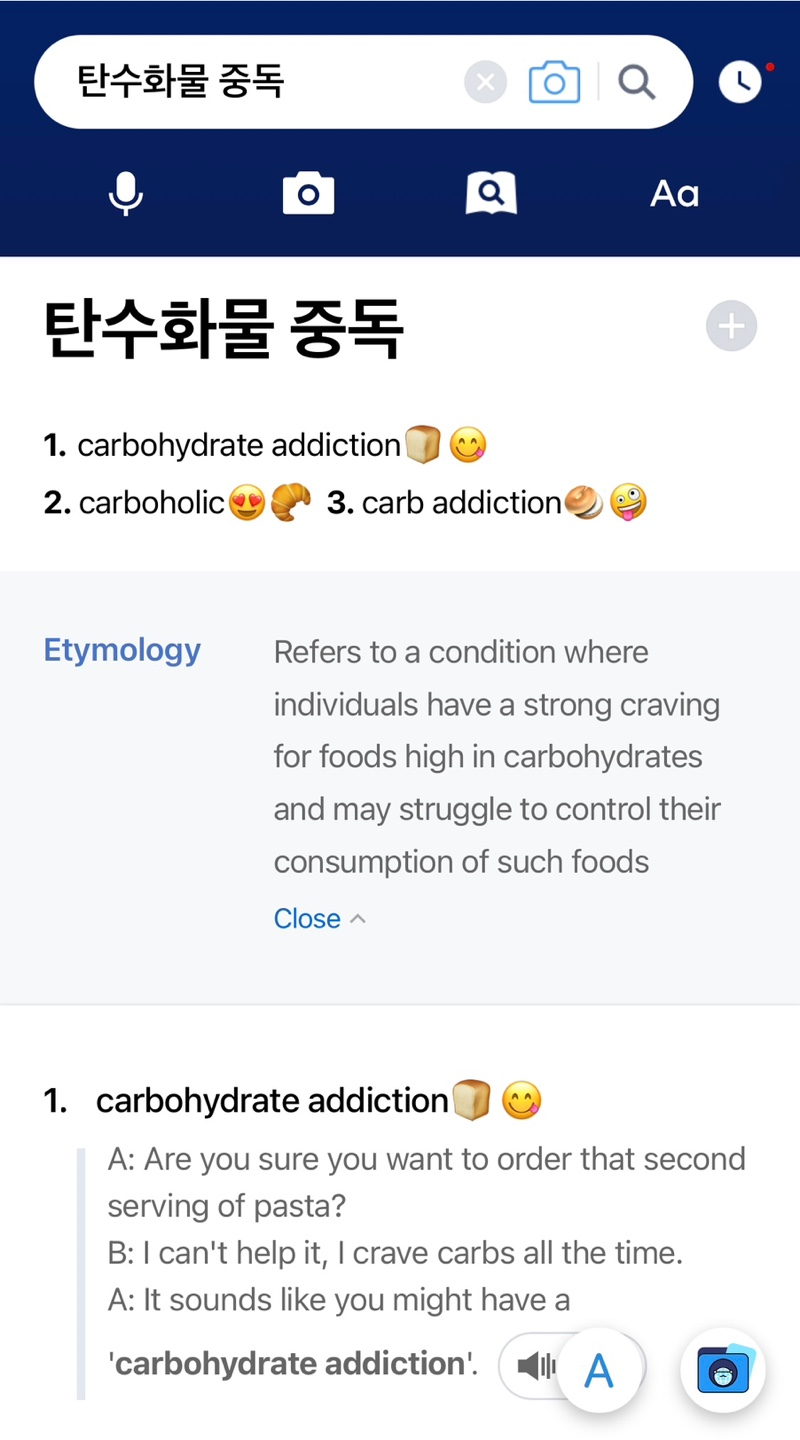 탄수화물 중독을 영어로 어떻게 표현할 수 있을까요? 요즘 현대인들은 바쁜 생활 속에서 탄수화물에 의존하는 경향이 커지고 있습니다. 다른 사람 얘기할 것도 없이 탄수화물 중독자 1인 여기있어요 ㅠㅠ
