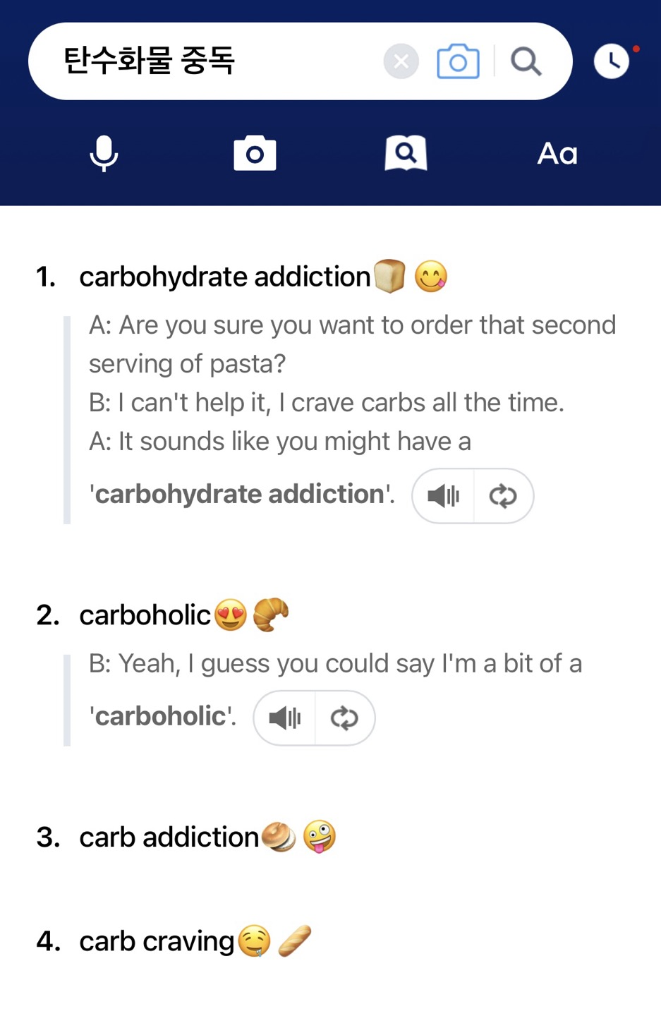 - A: It sounds like you might have a 'carbohydrate addiction'. (탄수화물 중독이 있는 것 같네.)