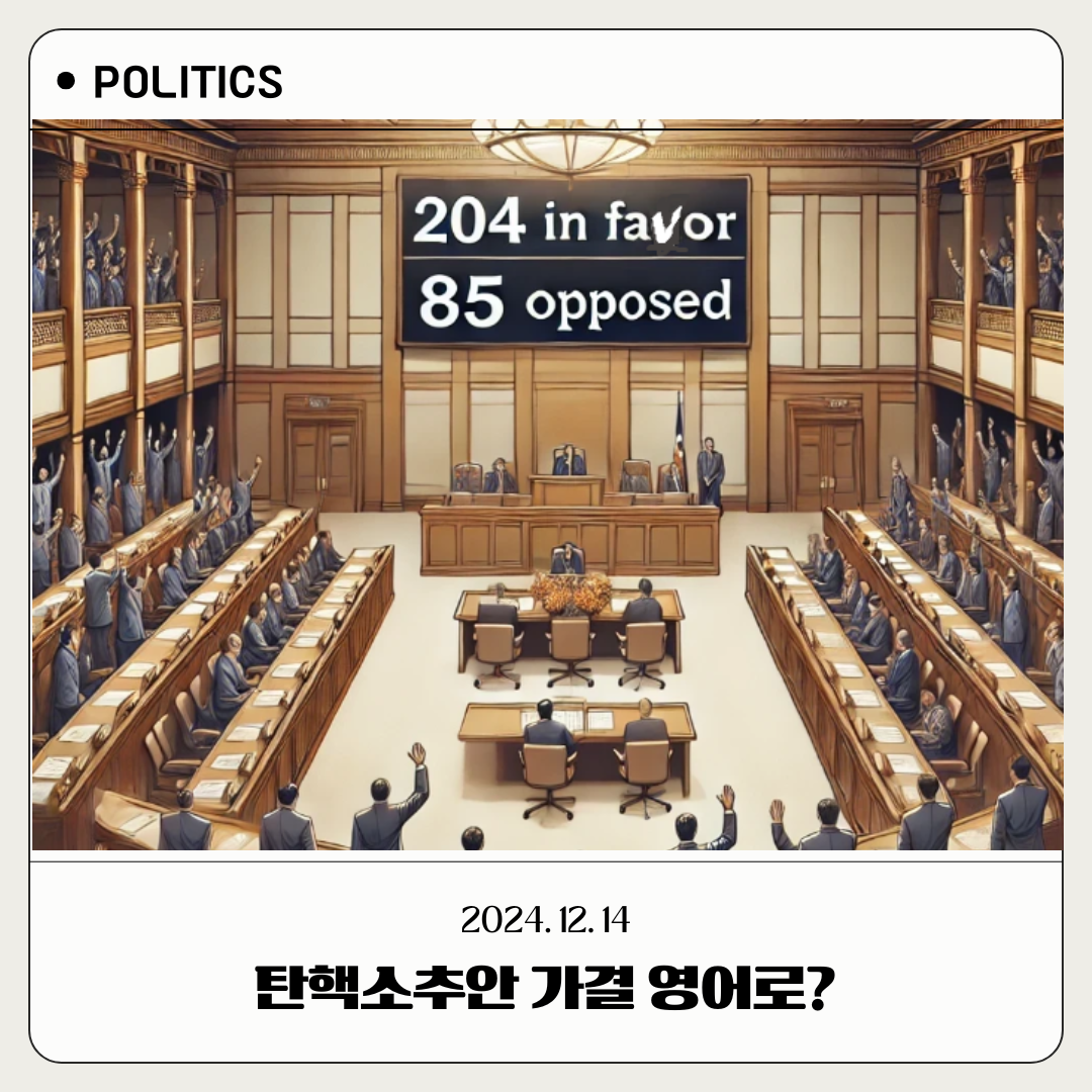 - “The impeachment motion passed with 204 votes in favor and 85 against.” (탄핵소추안은 찬성 204표, 반대 85표로 통과되었다.)