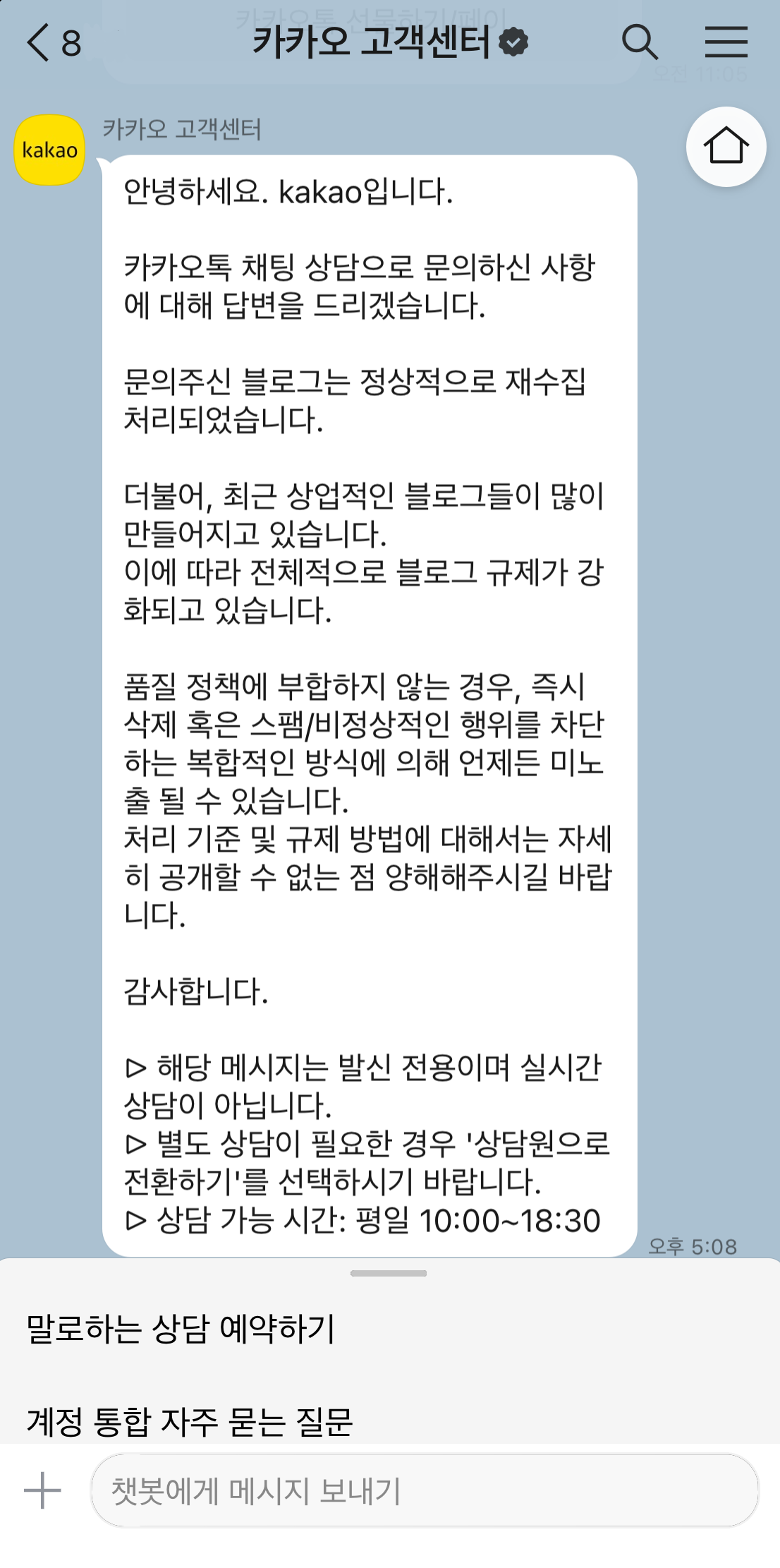 카카오 고객센터의 답변