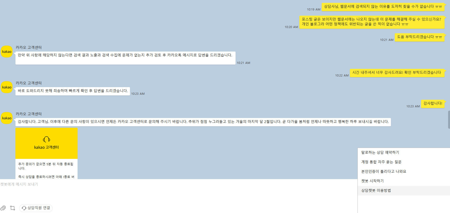 찾아보니 카톡으로 고객센터에 문의하는 게 가장 빠른 답을 얻었다는 인터넷 글을 읽고