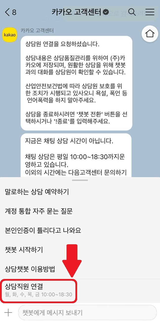 상담직원 연결을 통한 카카오 고객센터 문의