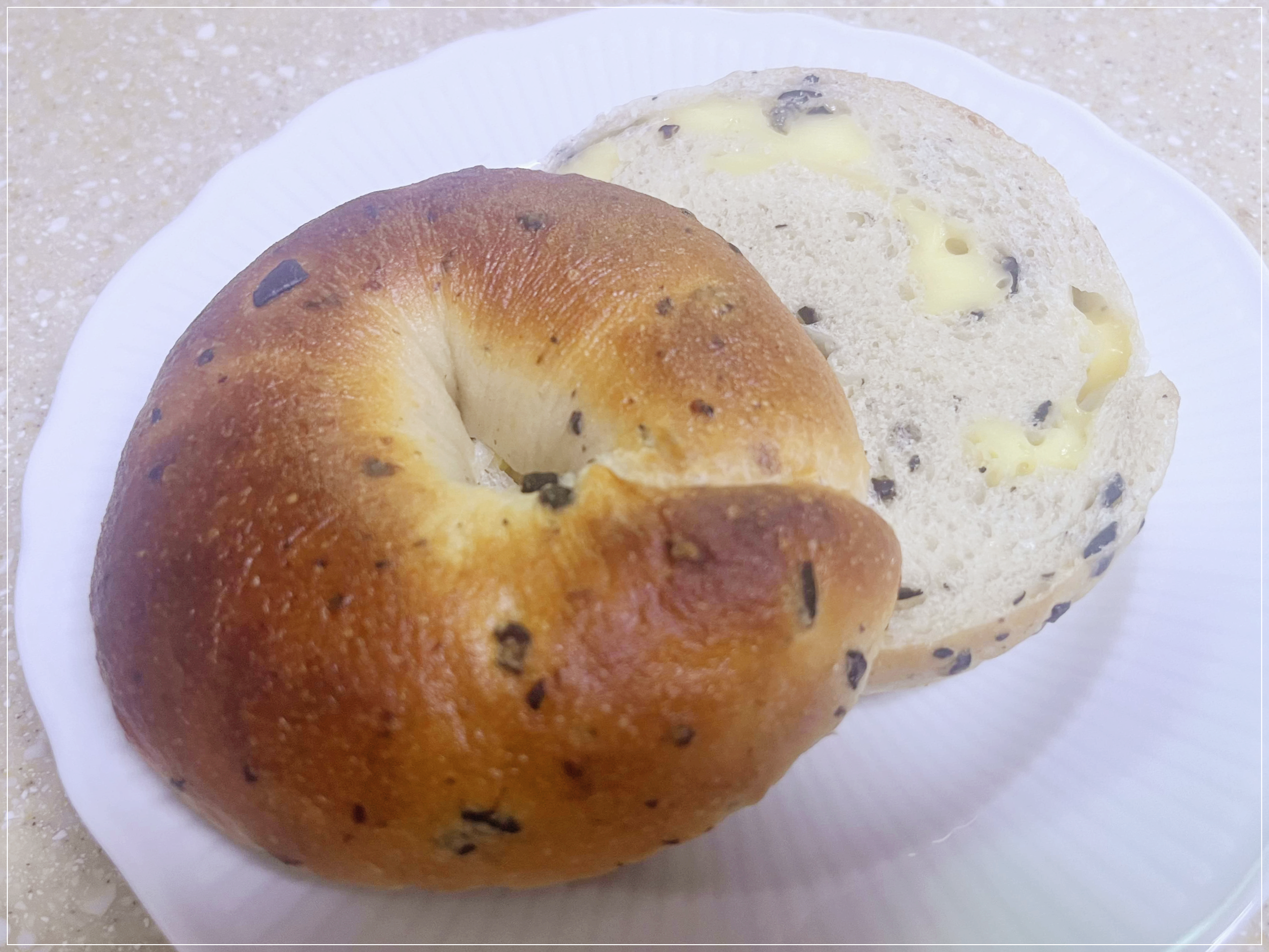 블랙올리브가 콕콕 박혀있는 이 베이글을 잘라보니